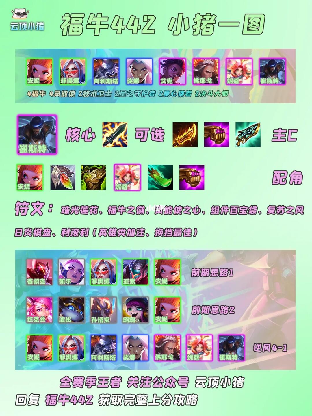 美测小猪玩的不算少,总体感觉比S8好一些,希望不是错觉吧。目前来说,运营阵容和赌狗阵容能玩的还是比较多,今天推荐一套当前版本T0(只要不大削)福牛442。
