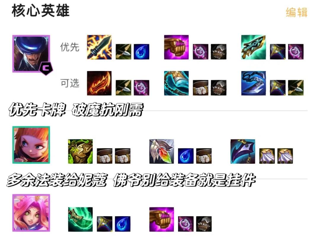 这套阵容锁血能力很强,连胜连败都能玩,破魔抗对于阵容很关键,装备对阵容提升也很大,最理想的情况是卡牌安妮妮蔻三个点全神装。