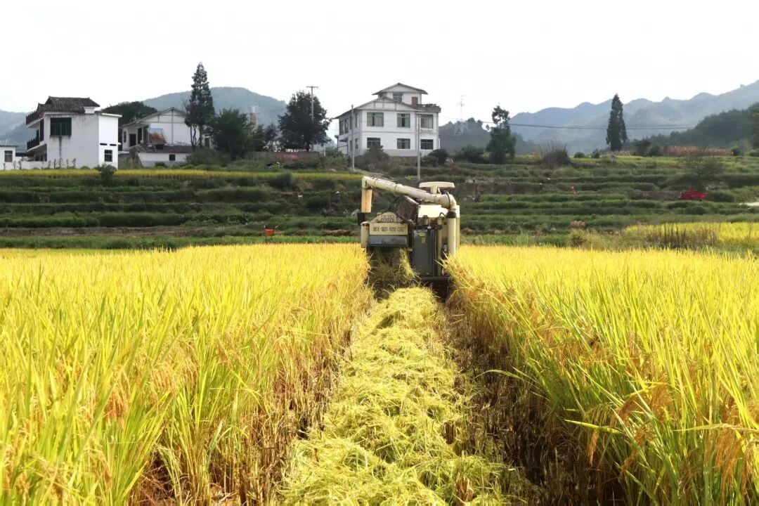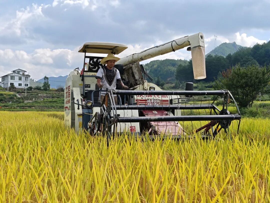 在开阳县禾丰乡底窝坝粮油高产示范区,联合收割机正开足马力,在金色的稻海中纵横穿梭,轰鸣声奏响了秋收的“交响曲”。