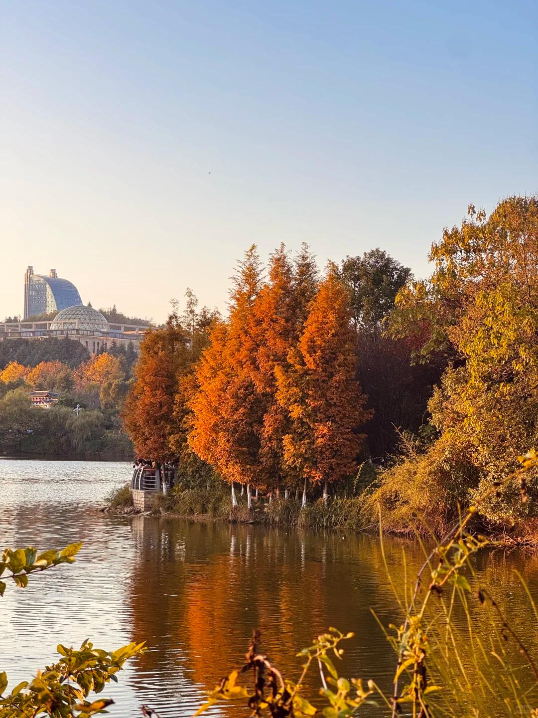 观山湖公园的秋色因为有水的映衬而格外动人。湖畔的银杏林倒映在如镜的湖面上,虽然枝叶尚绿,但已能想象它们披上秋装时的倩影。