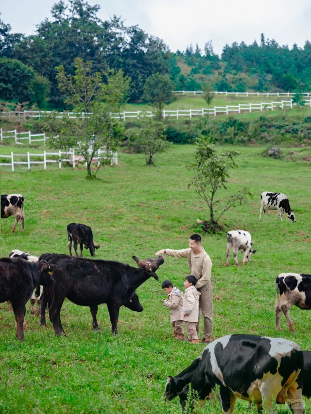 1️⃣牧场探险:0距离接触奶牛超有趣!黑白花的草饲奶牛超温顺,孩子抱着牧草喂食时眼睛都在发光