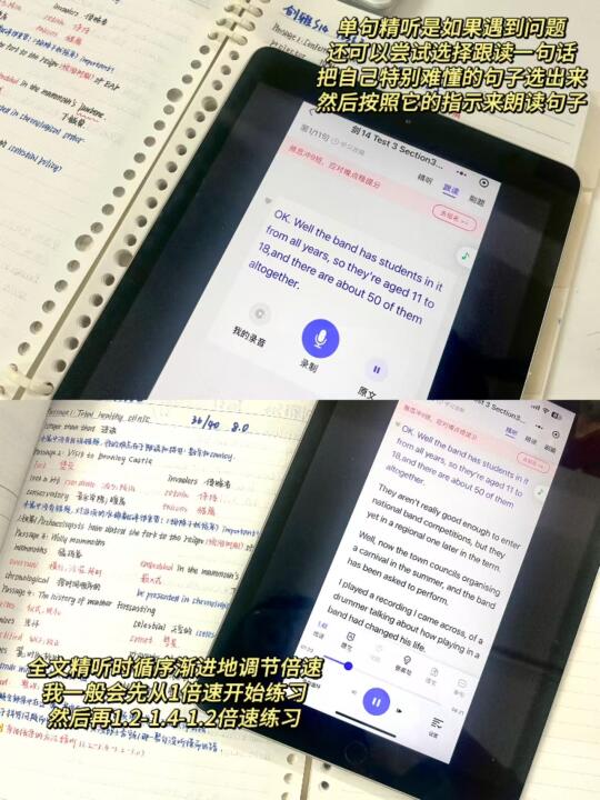 B.全篇精听:调节倍速(推荐1-1.2-1.4-1.2倍速精听四次,可以在听力音频左下角调节倍速)