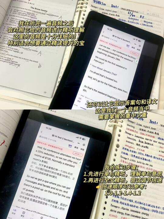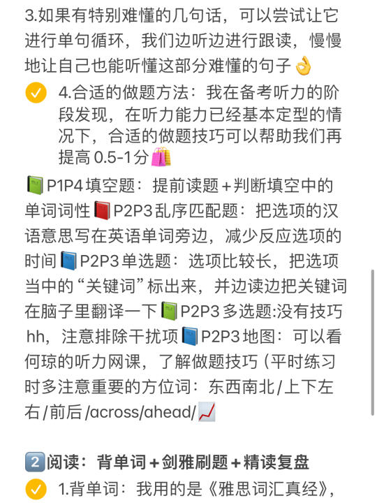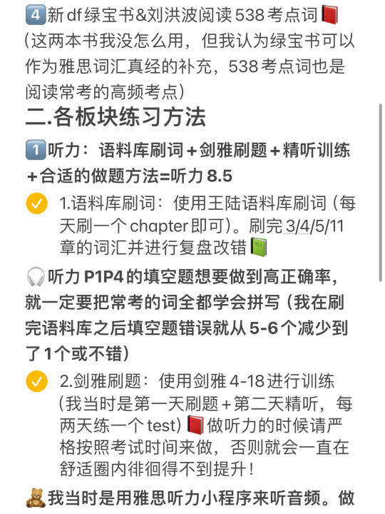 1️⃣听力:刷语料库+剑雅练习+精听训练+合适的做题方法