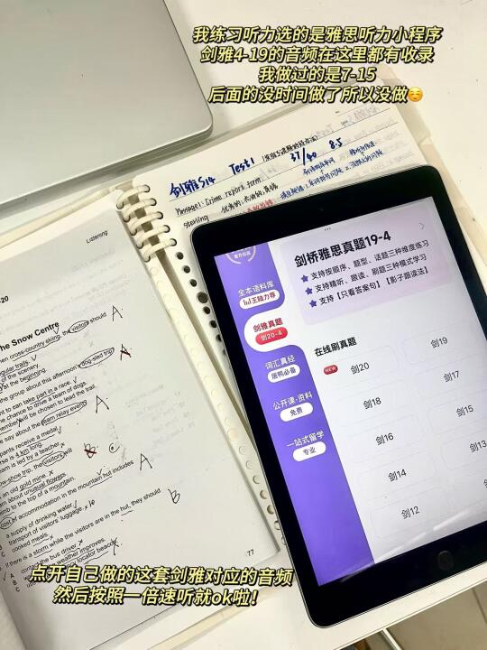 2.剑雅练习&精听:我选的是学为贵雅思听力小程序,这里收录了剑雅4-19的听力音频。我当时因为时间关系只做了7-15。我们可以先听音频进行在线刷题,刷完题之后对答案,然后再进行精听