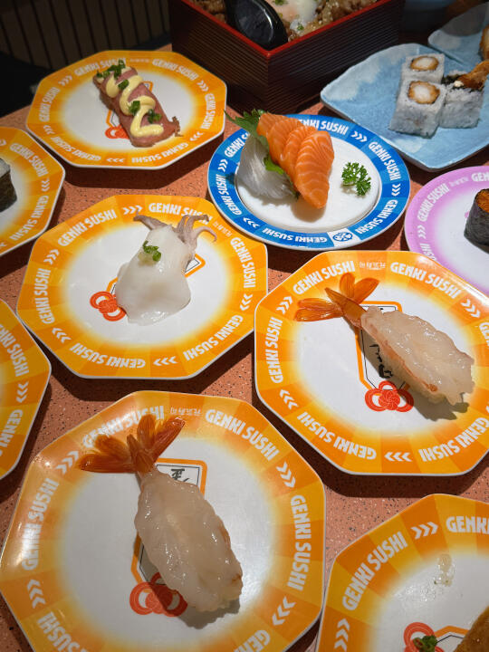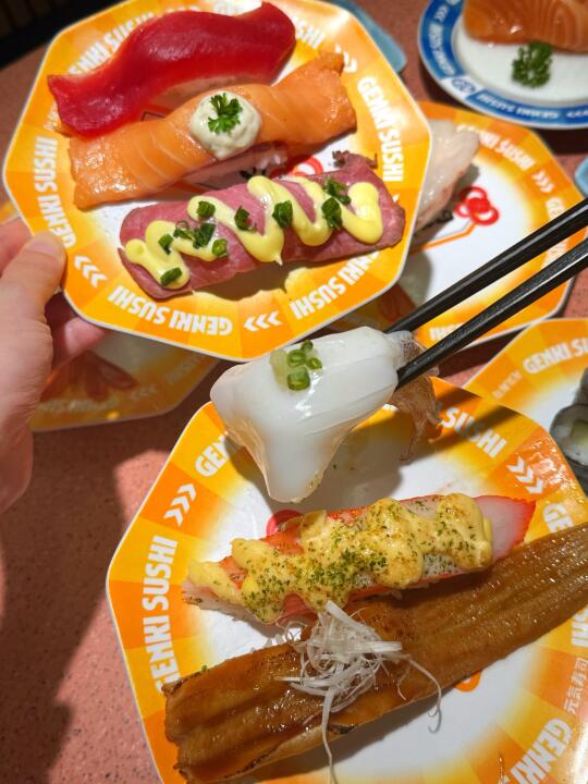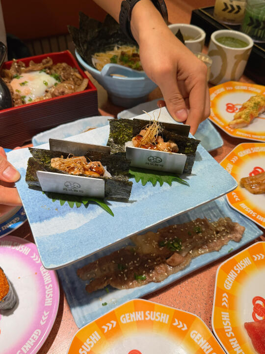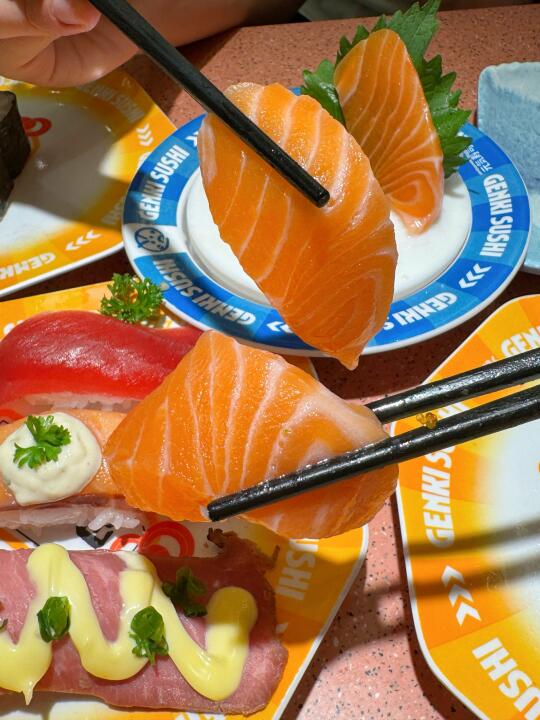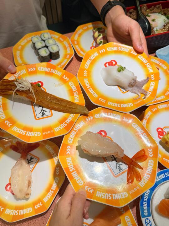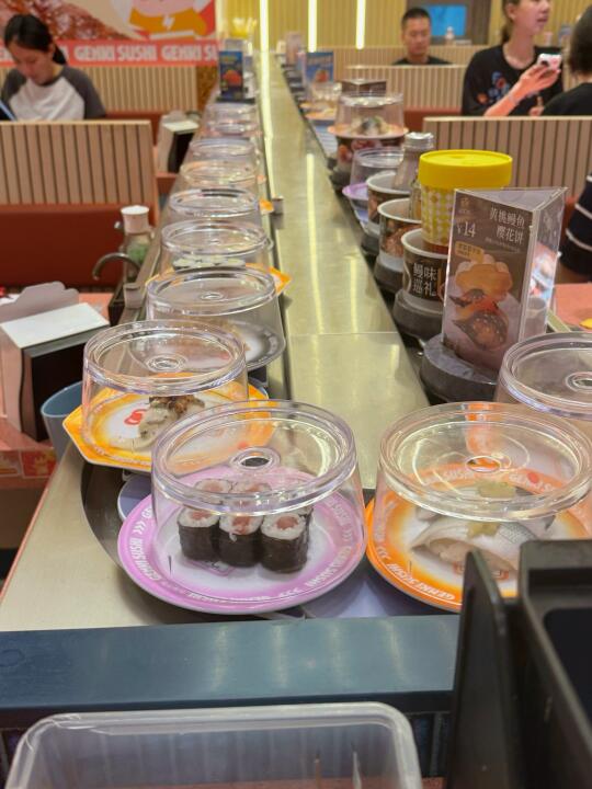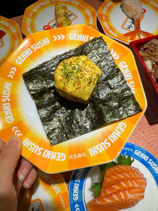 谁懂,也是吃到了陈豪同款寿司啦 到店直奔同款🍣拿下拿下!! 三文鱼刺身,每一片都很厚,纹理清晰可见 被鹅肝塔可卷吸引了🤩这个摆盘好好看耶✨ 海苔的酥脆➕鹅肝的软绵,口感好丰富👍 吃到炸虾卷🍤肯定会被惊艳到 一口下去,酥酥脆脆,吼吼吃!! 还有两份主食,猪软骨拉面🍜温泉玉子安格斯牛丼饭🍱 两个人吃,够够的,不愧是跟着陈豪点餐 金碟价格也很实惠哦,直接炫了好几盘 每一款都各有特色,旋转过来看到喜欢的就直接拿下 海苔包、大切牛肉、炙烤等,谁能拒绝啊💕 冲这一波真的不亏,太值得了!