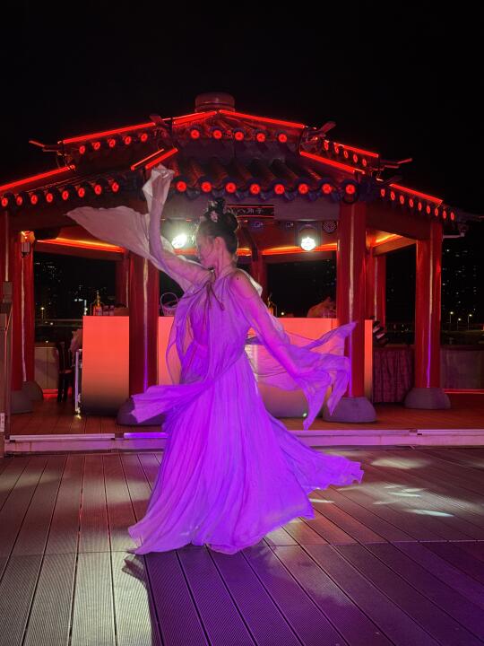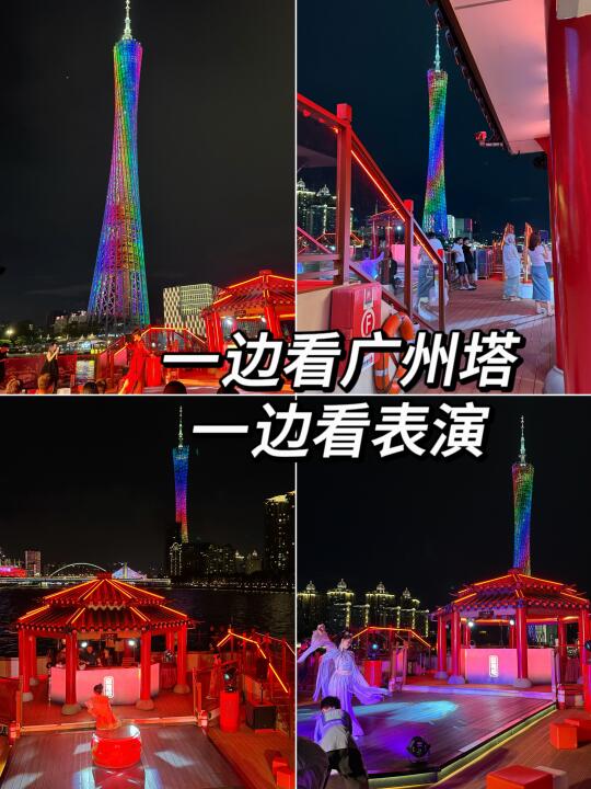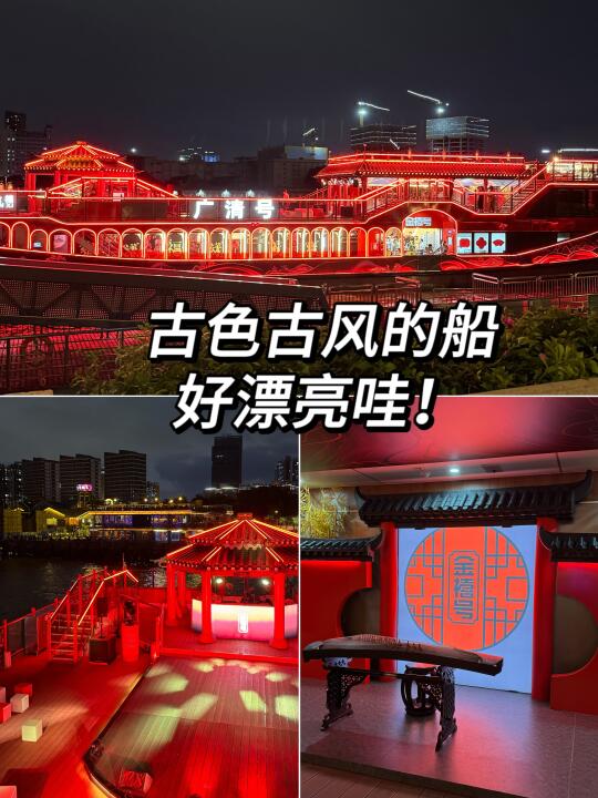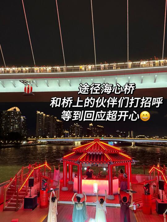 1️⃣国风游船:满满的国风氛围,红色为主色调,船上的八角亭、屋檐、灯笼,还有演出人员的汉服,都能体现了🏮岭南特色!