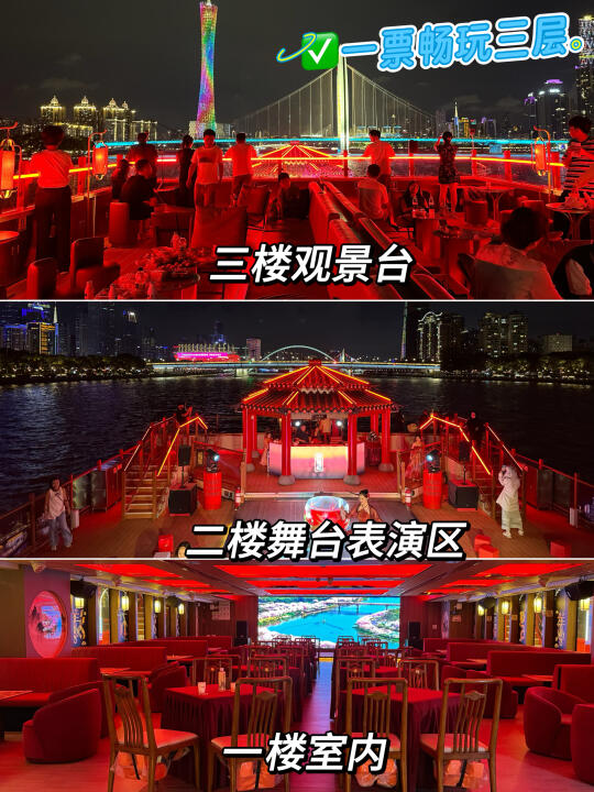 想去哪里就去哪里,一票畅玩3层,不同角度感受珠江夜游的美景和各种表演节目