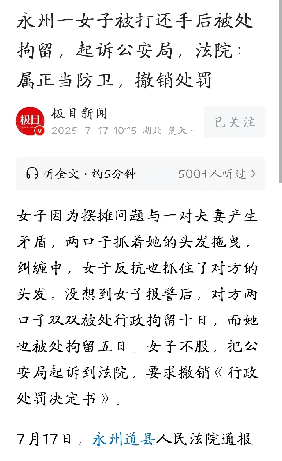 湖南永州,女子因为摆摊问题和一对夫妻产生纠纷夫妻两人一个抓着女子的头发拖拽,一个拖拽女子的脚,女子没办法只能还手抓对方的头发。事后,三人均有不同程度的受伤,民警认定为互殴,对夫妻行政拘留10日,对女子行政拘留5日。女子不服,认为她是正当防卫,把公安机关告上法庭,要求撤销对她的处罚,法院这样判!