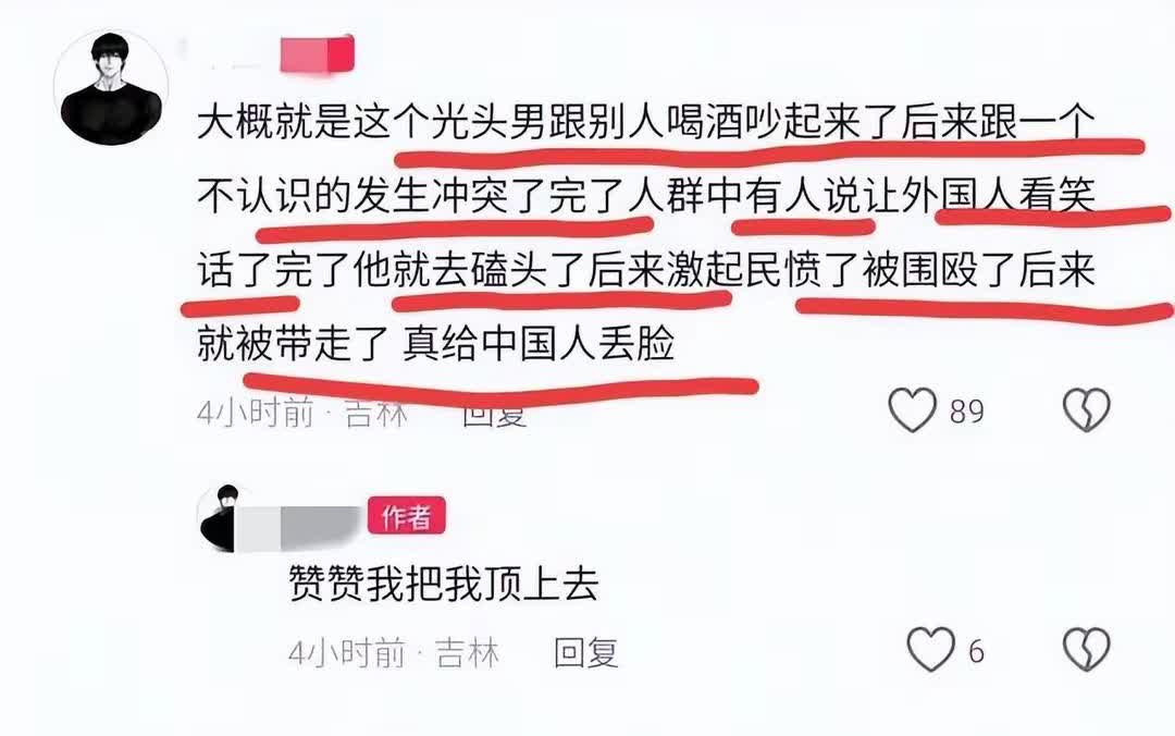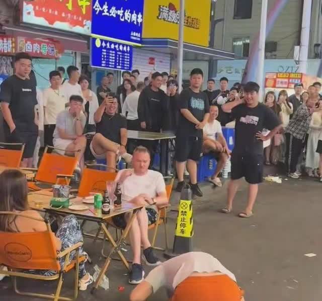 一男子在街头向一名老外下跪引发围观群众不满! 7月14日,吉林长春街头,一名男子向一名老外下跪,老外正和两名中国女孩吃烧烤,男子向老外磕头。 男子的举动引发围观群众不满,纷纷大喊让男子滚出东北!