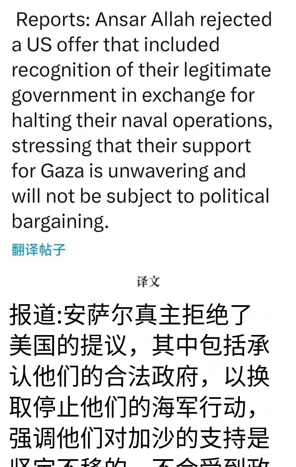 【拒绝美国提议,胡塞武装称支持加沙不存在讨价还价】 综合媒体消息,胡塞武装近日拒