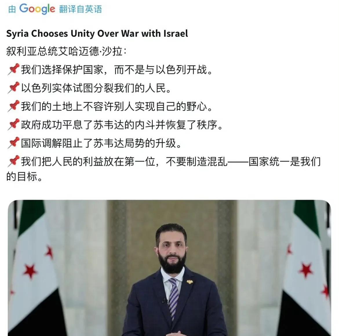 【内斗结束,叙利亚武装团体撤离苏伟达】 叙利亚过渡政府领导人朱拉尼在发表讲话时表示,以色列正在企图分裂叙利亚,但是叙利亚不会容许以色列实现他们的野心。 朱拉尼同时表示,为了保护叙利亚人民,叙利亚不会选择和以色列开战,叙利亚军队已平息了苏伟达冲突,秩序已经得到恢复。 同时,朱拉尼称将把保护德鲁兹人工作放在首位,并要求追究袭击德鲁兹人社区的责任人。 很明显,以色列轰炸叙利亚参谋总部是叙利亚军队撤离的主要因素。