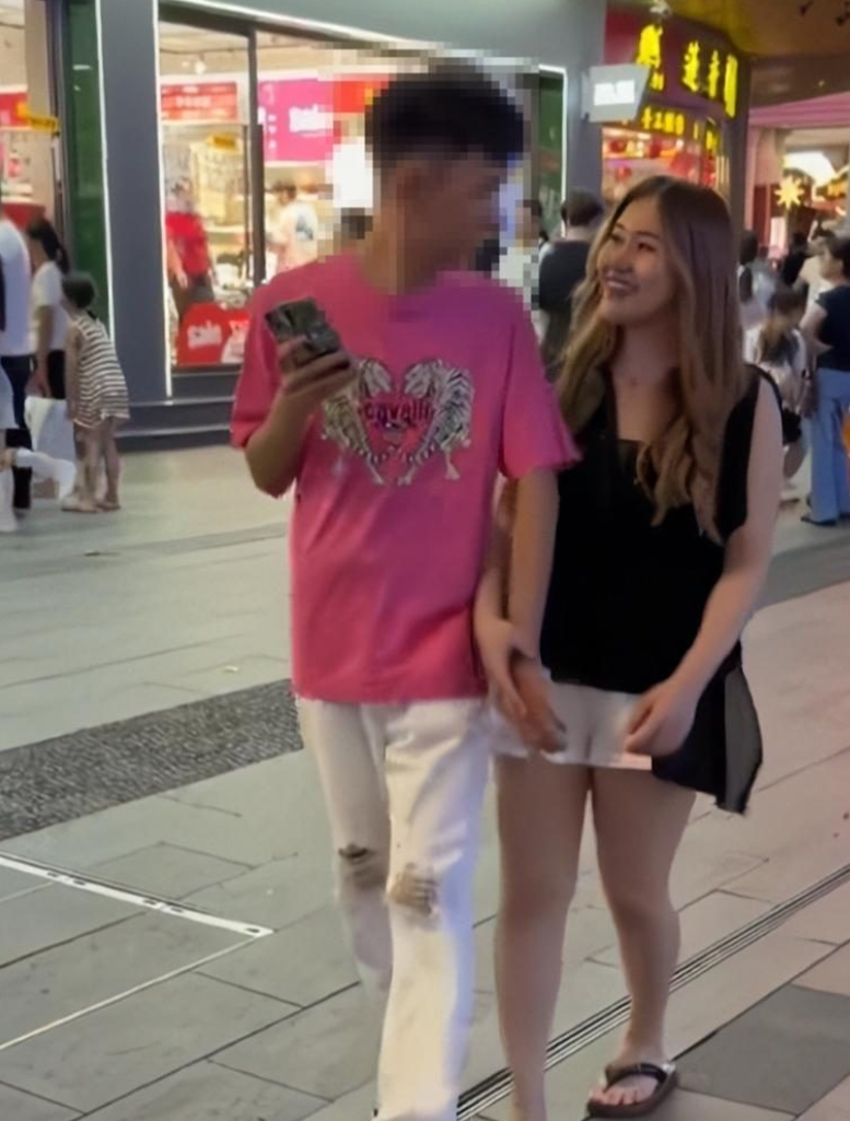 除了栽赃偷东西,她还搞了个所谓的“测试中国男人”。 在人来人往的商业街上,突然冲上去拉住陌生男生的手,看人家的反应。 这些行为从头到尾,她脸上都挂着笑,好像觉得特别有意思。