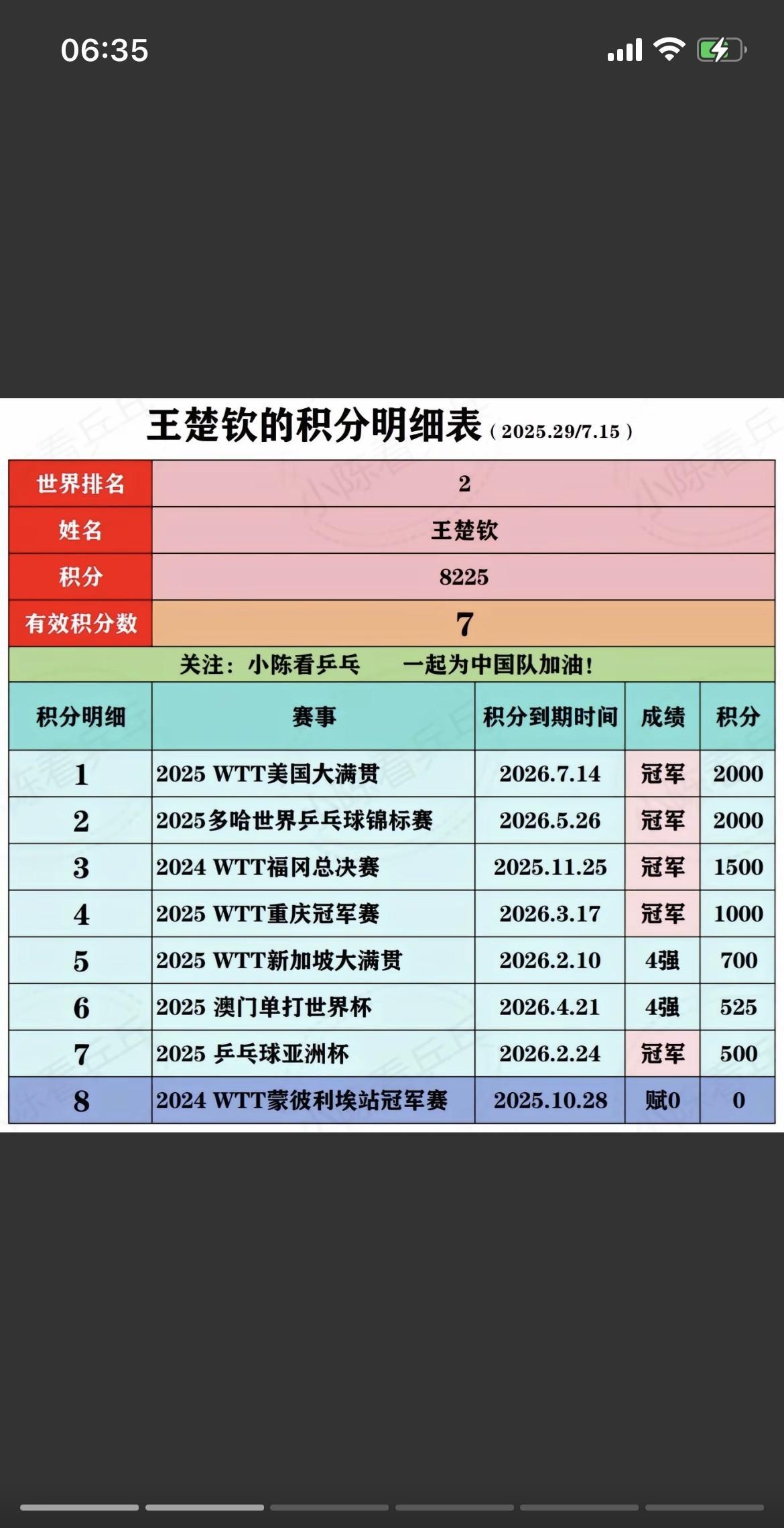 王楚钦世界排名第二的原因 王楚钦世界排名第二的原因是林诗栋有八个有效积分,王楚钦有七个有效积分。 2024年10月28蒙彼利埃冠军赛王楚钦没有参加,积分赋零。到2025年10月28日,满一年后王楚钦就有八个有效积分。届时王楚钦可能会重回世界第一。 你们觉得王楚钦会重回世界第一吗? 我觉得会,王楚钦在多哈世锦赛,美国大满贯中连续获得男单冠军。如果王楚钦状态不变,王楚钦必然会重回世界第一。只是时间问题。早晚会回到世界第一。