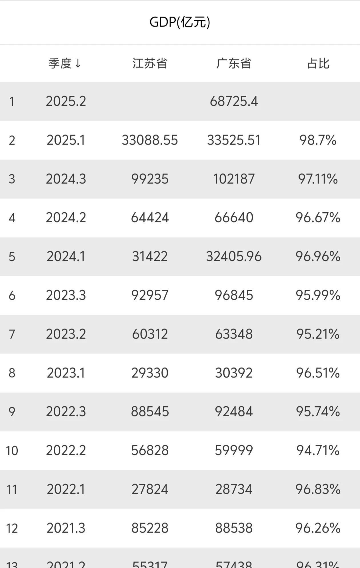 广东省2025年上半年GDP公布,增速4.2%,增量仅2085.4亿,不仅没有跑赢大盘,而且大概率被江苏超越,30几年来经济第一大省易主。 想过广东上半年GDP失速,没想到会拉到这种程度。归根结底,粤老大的问题在于广州、佛山、东莞已经失速,这两年一直靠深圳强撑着,今年以来深圳也撑不住了。 广东头部四城,目前四个都不同程度失速,这与江苏全面发展的模式,形成了鲜明的对比。#广州GDP增速# #2025gdp# #广州GDP# #广州GDP# #广东发展不均# #广东经济增速# #广东GDP增速#