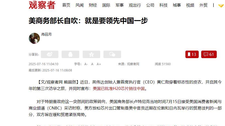 中国最好“识相点”!美国商务长卢特尼克在接受采访的时候表示,美国放松芯片出口管制是美中官员近期贸易谈判的一部分,中美都想要缓和贸易紧张局势,本来这里还挺正常的,但是他后面就开始“放飞自我”了,他声称让中国公司继续使用美国技术,这样才符合美国的利益,美国希望在技术方面能够领先中国,这样中国就可以继续购买美国的半导体了,中国可以买很多很多...... 说到底,科技竞争拼的不是谁能卡谁的脖子,而是谁的市场底子厚、创新劲儿足。 美国现在手里那点技术优势,撑不了多久;中国这边有全世界最大的半导体市场,还有一半的 AI 研究人员在埋头干,真拼起来,谁怕谁还不一定呢。 就说中国这些年的应对吧,压根没被美国的禁令吓住。你卡我芯片,我就自己搞研发。 华为、寒武纪这些企业,闷头把国产芯片做得越来越像样,现在弄出来的货,跟美国那 “缩水版” H20 芯片差不多能耐了。 可美国企业这边早就坐不住了。英伟达心里跟明镜似的,中国市场占了他们 13% 的生意,一年一百七十多亿美元呢。 他们比谁都清楚,真把中国逼急了,人家转头用国产芯片,美国企业哭都来不及。 再看美国这政策,简直跟翻书似的。拜登那会儿一个劲收紧出口,结果把中国逼得加速搞自主研发。 特朗普上台后更乱,去年还逼着英伟达搞 “缩水版” H20 芯片,今年 4 月突然说卖这货得许可证,冻住人家五十五亿美元的货,结果三个月不到又松口了,让黄仁勋能带着好消息访华。 这种朝令夕改的样子,不光企业头疼,更暴露了他们心里没底:既想赚中国的钱,又怕中国技术赶上来。 卢特尼克说的话更直白,让中国一直用美国技术才符合他们利益,说白了就是想靠着技术优势一直赚中国的钱。 算盘打得噼啪响,可他们没算到,越卡中国,中国自己的芯片跑得越快。 《华尔街日报》都看出来了,中国现在能做出和 H20 差不多的芯片,再这么折腾下去,美国想靠 “特供版” 赚钱,怕是没多少日子了。 其实美国这套 “又想卖货又想卡脖子” 的套路,早就不新鲜了。 可中国市场就摆在这儿,你不卖有的是人想卖,就算你卖,中国也没停下自己搞研发的脚步。 真等哪天国产芯片既能打又便宜,美国再想拿着 “缩水版” 当宝贝,谁还搭理啊? 这场芯片博弈的深层逻辑,从来不是简单的技术封锁与突破。美国试图用 “有限开放” 维系霸权,却忘了科技迭代的本质是活水流动。 当中国在自主创新的赛道上跑出加速度,当全球产业链越来越离不开中国市场的滋养,任何试图筑墙的行为,最终只会把自己困在技术迭代的死角。