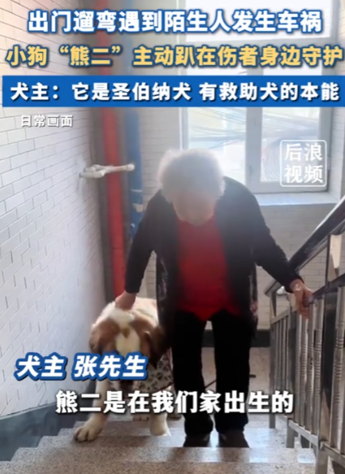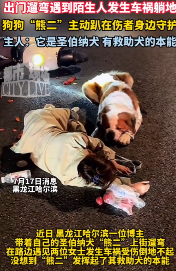 “太有灵性了!”黑龙江,男子出门遛狗,遇到2个女生发生车祸,趴地上动弹不得,他急忙打120,没想到,小狗“熊二”为了不让其他车压到女生,竟然主动趴在女生身边守护,男子称:“熊二”是圣伯纳犬,有救助犬的本能! 据都市现场7月18日报道,小狗“熊二”和主人遛弯遇到路人出车祸,主动趴下守护伤者。 张先生每天都会带着自家养了4年的圣伯纳犬“熊二”出去遛弯。 那天跟平常一样,他们正往家走呢,突然路边发生了一起交通事故:两位女士被车撞倒,场面挺吓人的。 张先生反应挺快,立马掏出手机报了警、叫了救护车。 但让人没想到的是,旁边的“熊二”也做出了超让人感动的举动。 它看到地上的人动不了,又有车不停地从旁边经过,自己立马跑上前,直接趴在伤者身边,,它就那样当起了“活盾牌”,尽全力防止其他车辆靠近,防止出现更大的伤害。 你要说“熊二”是偶然为之,那可真不是。 张先生说,熊二从小就特别通人性。 它是在家出生的,从小在张先生家长大,个头虽然大,但脾气特别好,还特别会照顾人。 他奶奶98岁了,出门散步,熊二就一直跟着,奶奶上楼它也在边上小心翼翼地“护送”。 家里小孩要是哭闹,它也会第一时间跑过去,用脑袋轻轻贴着他们,安静地陪着。 这次的事被张先生拍下来发到了网上,立马引发关注。 网友们一边点赞一边感慨:“这狗也太通人性了吧,简直比人还暖。” 还有人开玩笑说:“是不是得让救护车也多安排个‘狗位’,顺便把熊二也一起接走?” 像“熊二”这样的狗狗,不止这一只,在黑龙江,有位女士散步时突然晕倒了,她家的金毛急得团团转,一边蹭她一边冲着路人叫,最后医护人员赶到,它还坚持跟着上了救护车,一路陪到医院。 狗狗虽然不会说话,但它们的忠诚和善良真的能穿透人心。 熊二的这次“出手相助”,不仅守住了伤者的安全,也让大家看到了动物那份最单纯、最温柔的感情。 信源:都市现场