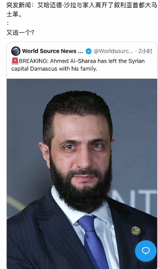 7月18日,阿拉伯“广场电视台”等多家中东媒体报道称,叙利亚过渡政府“总统”朱拉尼已携妻儿逃离大马士革,原因与“国防部长”等三名高级官员突然被杀有关,朱拉尼认为大马士革已不再安全 他又要干老本行了?