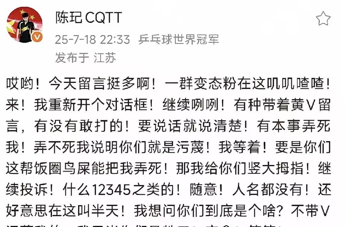 邱贻可沉默了!陈玘化身杀神继续战斗! 陈玘又发文了! 言辞犀利,大义凛然! 邱贻可呢?能不能和你杀神哥哥一起战斗啊! 广大球迷支持你陈玘! 饭圈乱象不除,国乒就无宁日! 邱贻可没接茬儿?估计很多人要问了。这位老队友,现在的孙颖莎主管教练,处境确实微妙。一线带队员,每天跟球员、教练组,包括上面领导打交道,讲话空间哪有已经退出一线的陈玘那么自在。陈玘是开炮了,邱贻可想的是“怎么灭火”。立场未必不同,站出来的方式肯定不一样。要求他立刻应和陈玘,喊着“杀神哥哥”并肩作战?有点强人所难,也不太现实。他肩上的担子让他没法像老战友那样“自由开火”。 说到底,国乒想真安宁,得靠“硬规则”打底,大家守住专业体育的底线。让队员们回归训练场和比赛本身,少在“饭圈战场”分心。球迷喜欢球赛,那就支持精彩的对抗,少掺和那些乌烟瘴气的“粉圈战争”。这事儿,任重道远着呢。