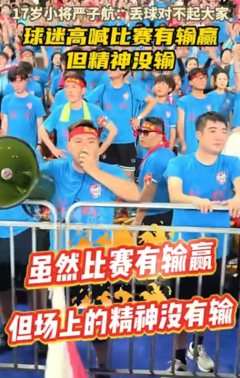 而另一面,盐城队的球迷们拿着大喇叭给自己的球队打气,也是在肯定他们的付出:虽然比赛有输赢,但我们场上的精神没有输。