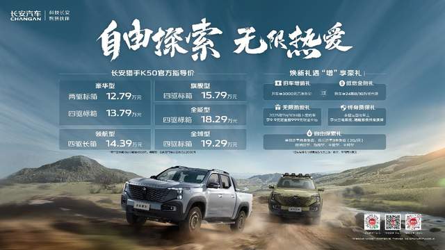长安猎手K50,为新生活方式而生,现已全系上市,以超级外放电、极致可靠性与全域适应性,和用户共创共建共享“自由探索、无限热爱”的出行生活。即刻出发,一起奔赴山海,践行热爱。