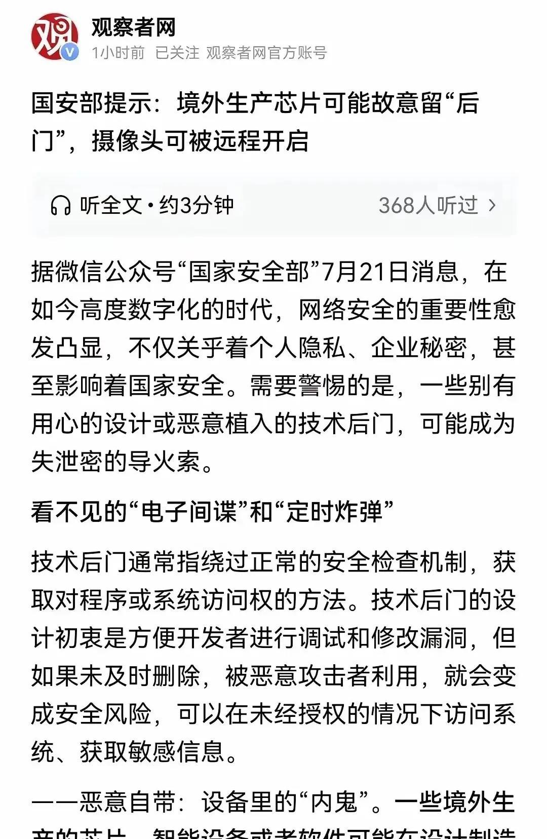 英伟达H20阉割版人工智能低端芯片大买家出现了吗? 难道这就是黄仁勋口中的中国11家互联网大客户吗? H20已被政府提醒有后门,而且还是美国去库存的低端芯片,马上面临停产等。强烈呼吁坚持用国产芯片,H20不安全,小心有诈,配合国家战略,不能让美国得逞,从我做起!