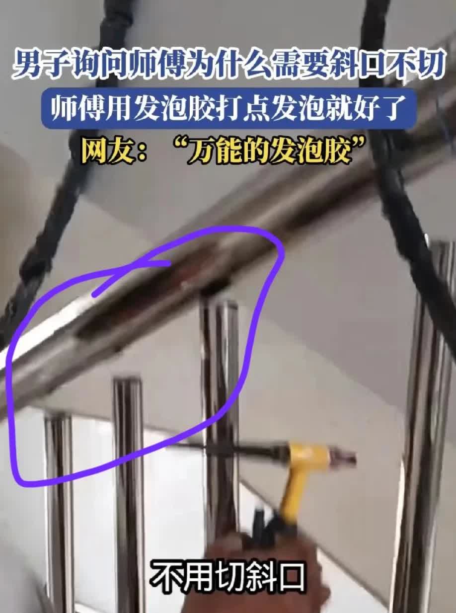 男子雇工人师傅焊接楼梯护栏,看到工人师傅径直把截好的小白钢管往大白钢管上焊接,男子赶忙叫停工人师傅并质问:“你这个东西不用切斜口吗?”工人师傅答道:“不用切斜口,到时候打点发泡胶就行。”男子疑惑地问:“这个也打发泡胶啊?”工人师傅肯定地点头说打发泡胶。男子懵了,不知说什么好了。他是那真拿我智商为零吗? 在工人师傅眼里,发泡胶是万能的。什么都能用,中午吃饭两管发泡胶下去就饱了。完工后,建议男子往工人师傅钱包里也打两管发泡胶。
