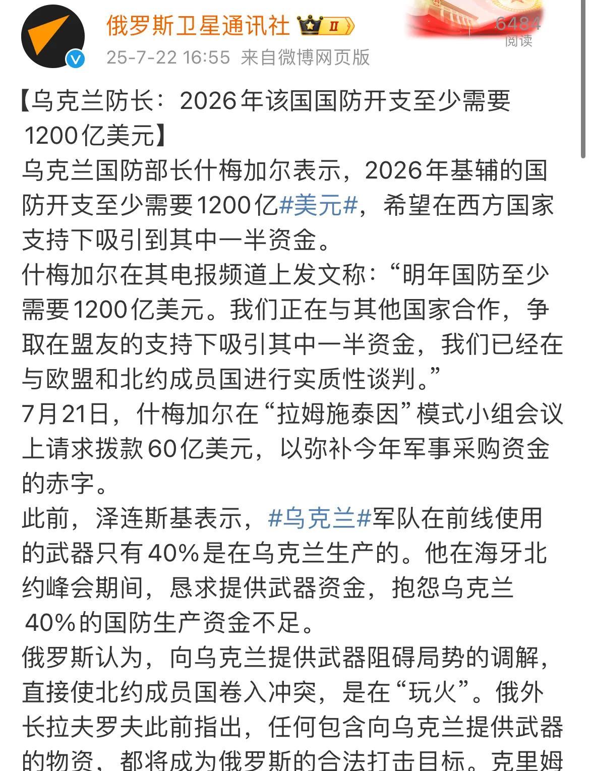 【乌克兰希望盟友能分担明年一半的国防开支】 据俄卫星通讯社消息,乌克兰国防部长什梅加尔在电报频道发文表示,乌克兰2026年需要1200亿美元的国防开支,他希望盟友国家能够提供支持,至少吸收一半的资金。 自俄乌冲突爆发以来,乌克兰盟友国家对乌克兰的支持力度明显下降,就连美国也曾多次威胁要中断援助,法国甚至因为财务问题不愿意联合购买援助武器,如今乌克兰希望得到600亿美元的支持并非易事。 与此同时,俄罗斯已明确表态,对乌克兰的支持只会影响双方之间的和平谈判,离冲突结束只会更加遥远。