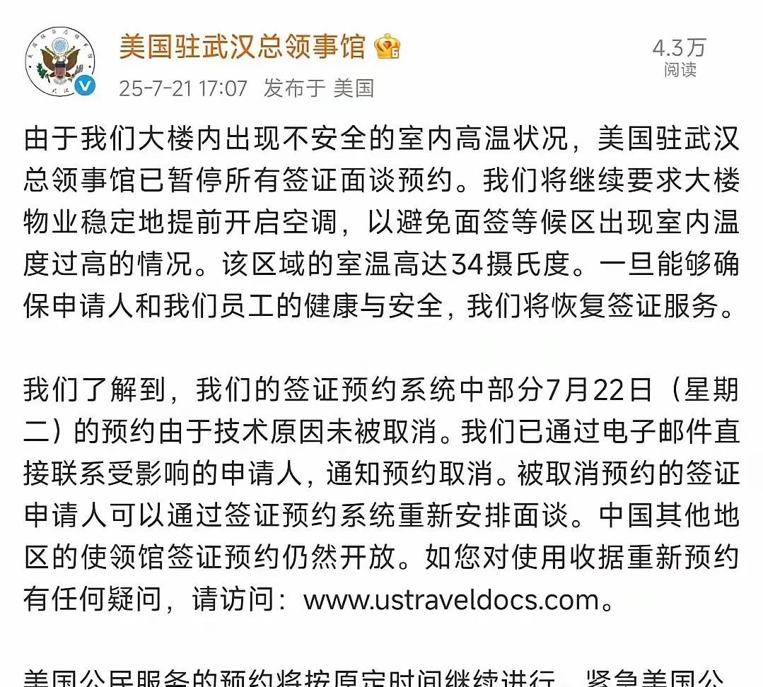【无法忍受高温,美国驻武汉领事馆被迫暂停签证面谈业务】 近日,美国驻武汉总领事馆