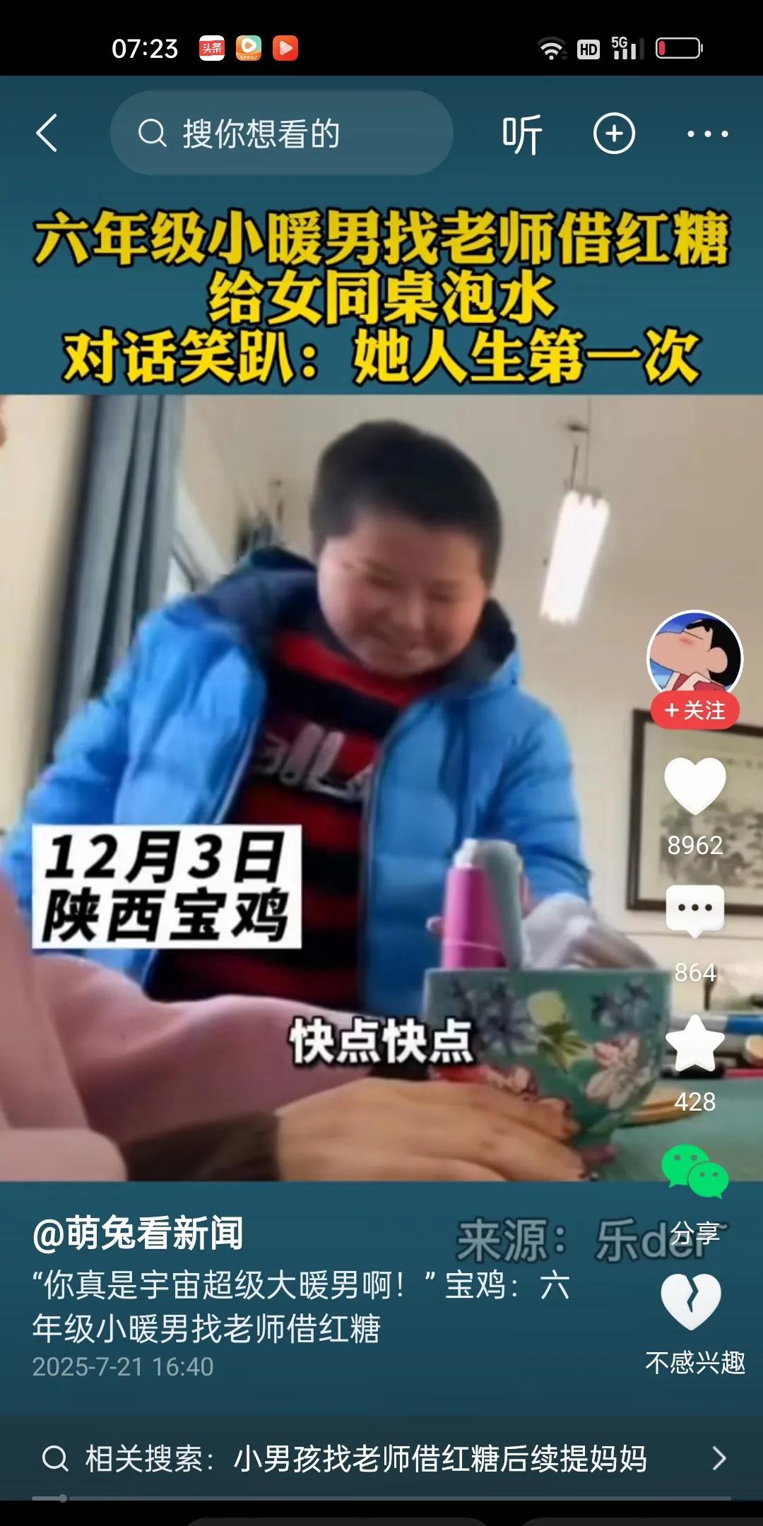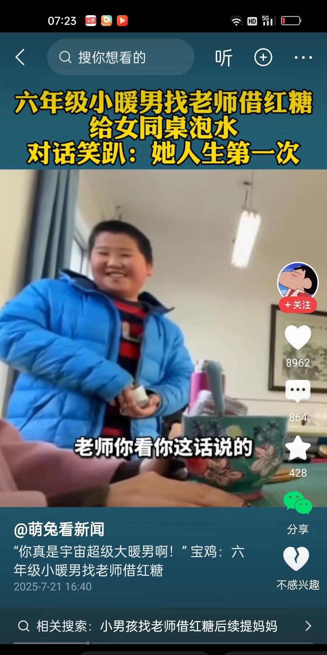 六年级小暖男找老师借红糖泡水。老师逗他,给谁要了?小暖男回答给同桌。老师问为啥要了?男孩有点害羞,老师,你看你这话说的。男孩泡好红糖水,转身走的时候,对老师说,她人生第一次。老师们笑喷了,这小屁孩懂的还挺多。小男孩知识挺全面,热情大方体贴人,以后不愁娶不到媳妇。现在的小学生都这么早熟的吗?生理卫生健康比大人都懂。