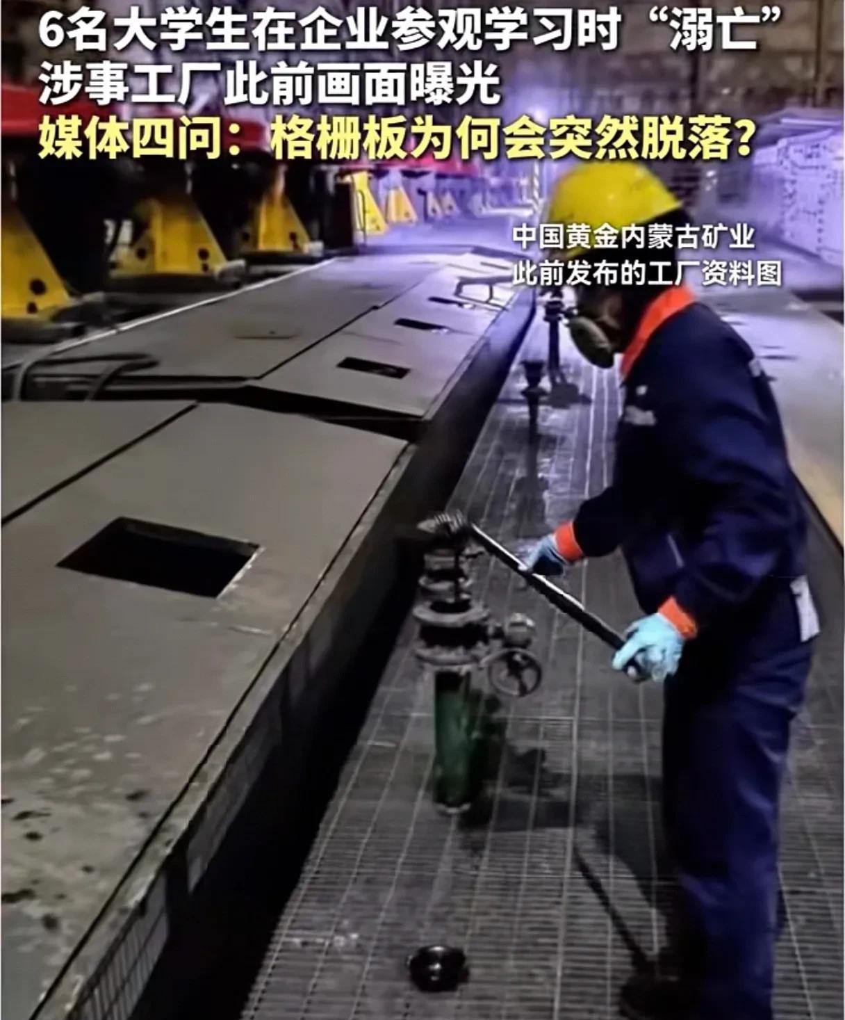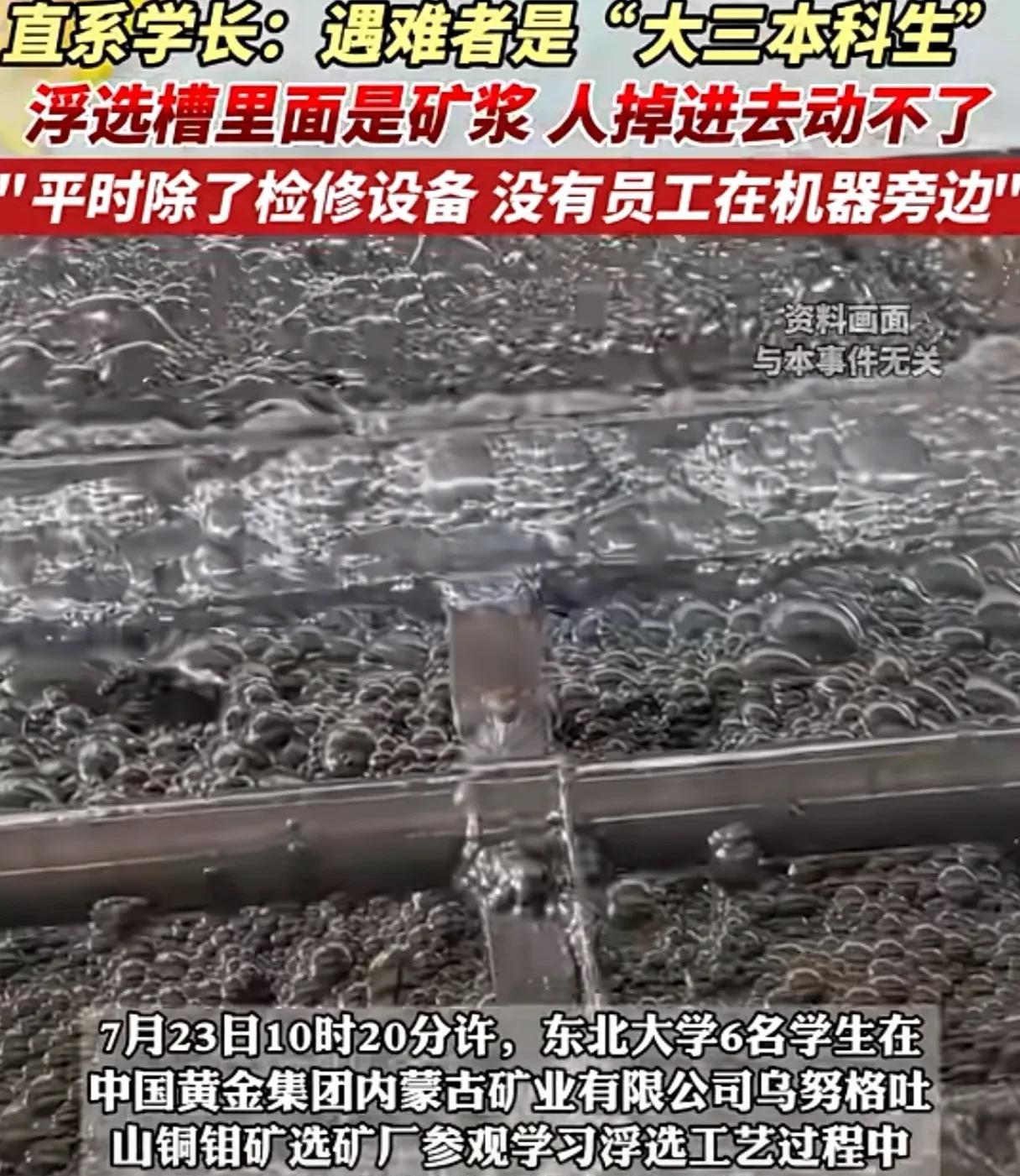 内蒙古将提级调查6名学生“溺亡”! 6名东北大学的高材生只是参观学习却丢了性命,家属心痛,网友心痛! 浮选槽是选矿工艺中的关键设备,矿浆密度高于纯水,黏稠且流动性差,温度接近100℃!底下的矿浆是带有腐蚀性的。6条鲜活的生命掉下去2-4米深,便无法动弹,几乎只能在里面等死,其惨烈场景我们可以想象却又不敢去细想! 据企查查信息显示,2021年,呼伦贝尔市应急管理局对中金内蒙古矿业实施检查,发现隐患27条。梳理发现,在2021年就被发现27条隐患。而在2024年,中金内蒙古矿业还因未批先建,企业和主管负责人共被罚款51.8万元。 一个简单的逻辑,化学水气上升不停的腐蚀格栅板。明明这样的企业应该是最重视安全生产的,却没有重视竟然有这么多安全隐患! 随着媒体扒出来更多的细节,六名大学生并不是没有安全意识,不小心掉进去了,而是他们站在格删板上面,整个板掉下去了,中金黄金啊,作为上市企业,安全生产意识薄弱却又如此不堪设想! 事发后涉事公司通报“口吻”也遭网友质疑:他们轻描淡写的说学生只是“溺亡”。说老师只是受伤。而学生们掉进矿浆时承受的痛苦就这么被抹去了。包括所谓的老师截肢也只是说“受伤”两个字? 目前,曾获东北大学优秀实践教育基地的这家矿业公司已经停产。 6个孩子关系到6个家庭,太让人心痛了!网友:期待真相!希望这次好好查查吧!
