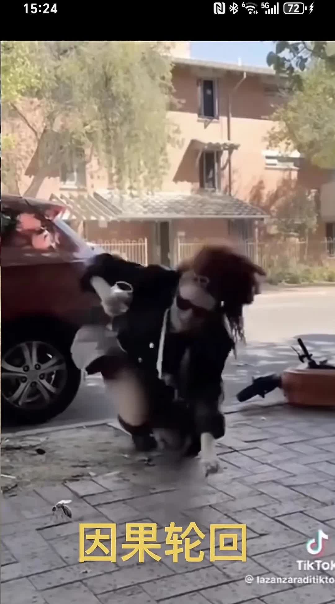 因果轮回~ 女子手中拿着一杯奶茶,把停在那里的电动车用脚踢翻,当她转过头回来的