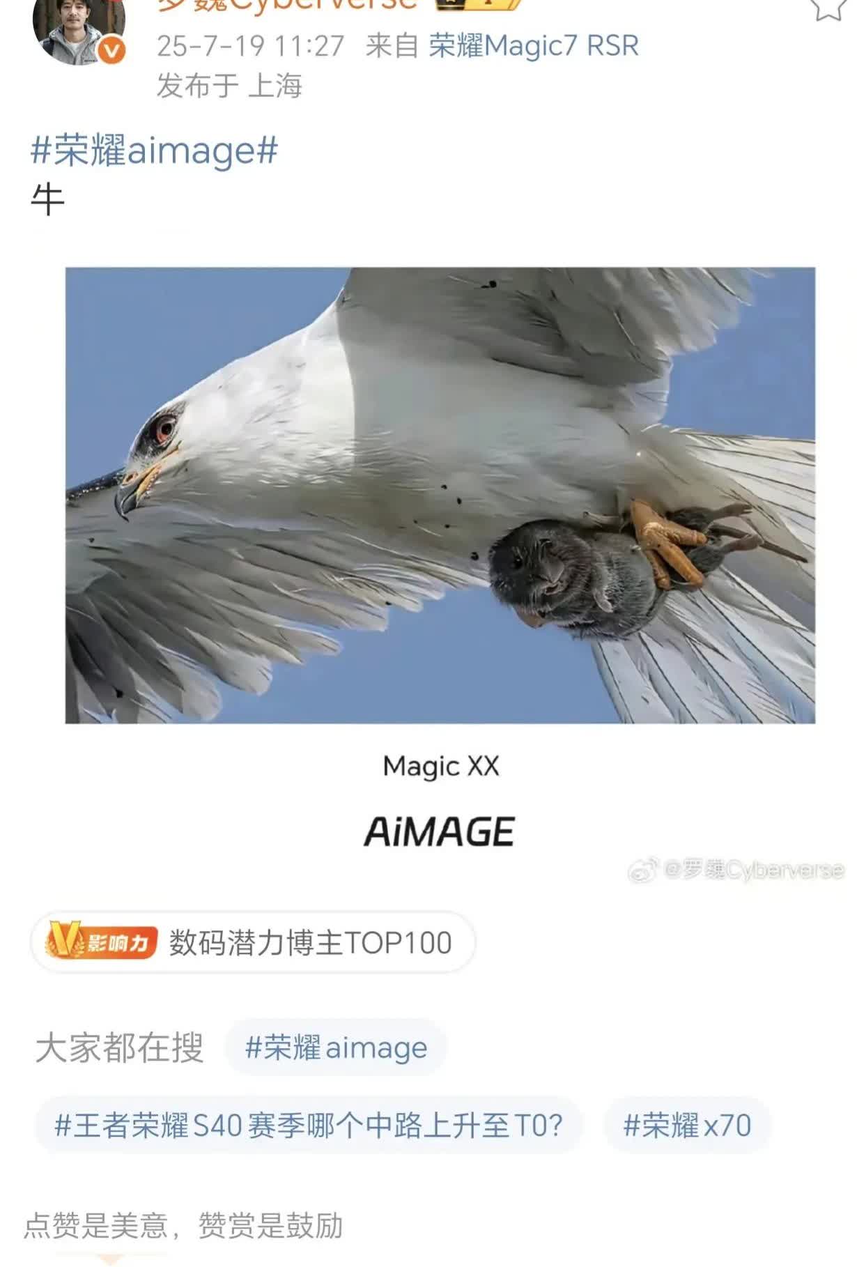看完这张样张,荣耀下一代旗舰的影像表现确实值得期待。 近日,荣耀首席影像负责人罗巍发布了一张老鹰抓老鼠的飞翔照片(边框水印:AIMAGE),同时透露将在下一代荣耀旗舰上正式发布全新影像品牌。 AIMAGE [给力]