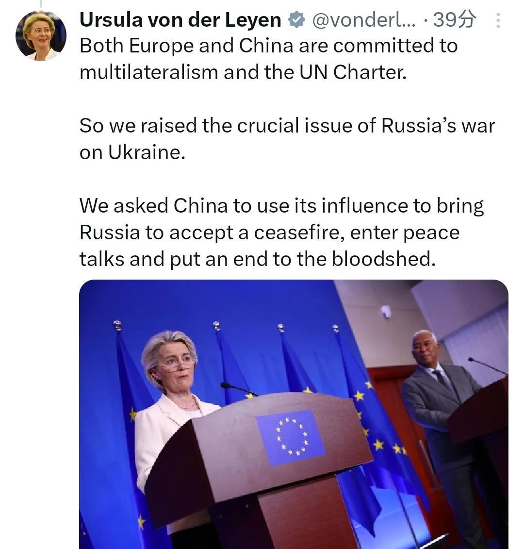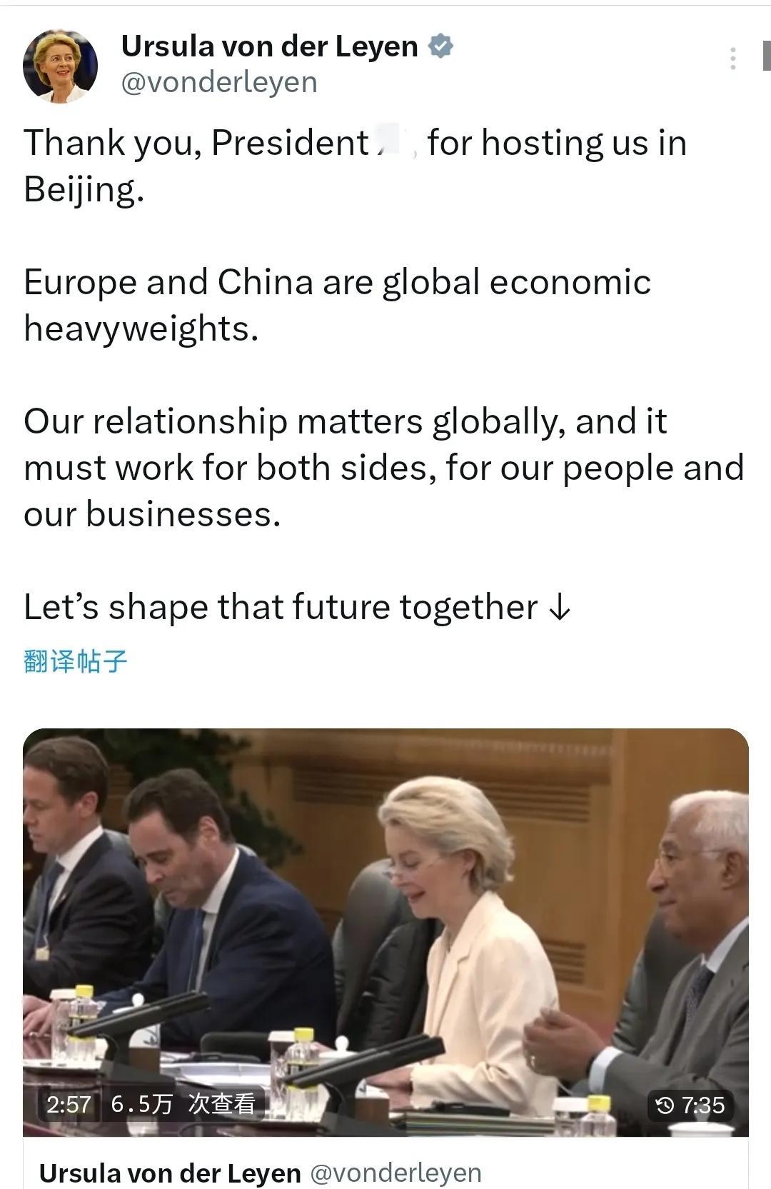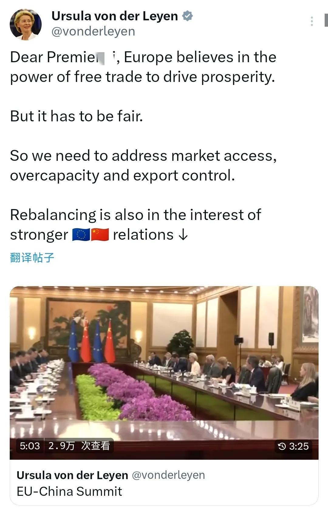 7月24日,中欧峰会短暂且充实的日程已经结束了。从冯德莱恩或者欧盟的视角来看,如何总结这次峰会呢?可以总结为:6条发文、2场会议、1个联合声明和1场记者会。仔细盘点一下这“6+2+1+1”,欧洲到底说了一些什么呢? 首先,冯德莱恩一天之内连发6条推文,记录了全天的活动情况。总体上看态度还是非常积极的,不仅展现出北京的风和日丽,而且表态“中欧要共同塑造未来”( Shape the future together)。这个讲法还是很有突破性的。 其次,冯德莱恩等人共进行了2场重要会议。上午的第一场会议,谈的更多是理念、大方向和原则,中方也提出了未来中欧关系发展的“三大主张”。下午的一场会议谈论更多具体的务实合作项目,尤其是人工智能、数字经济、绿色发展等,并且提到打造“升级版”中欧出口管制对话机制,保证中欧产供链稳定。这也呼应了欧洲方面的核心诉求。 第三,中欧共同发布了《关于应对气候变化的联合声明》,这也是目前中欧共同利益和立场最为集中的领域。尤其是在特朗普退出全球气变治理之后,中欧有责任、也有能力去领导全球气候治理的后续议程。其中,欧洲在规则、规范上有经验;而中方在绿色技术和新能源上有优势,中欧有广阔合作空间。 最后,冯德莱恩和科斯塔晚上开了一个20多分钟的简短记者会,并回答了记者提问。我听了全程,发现其中有三个之前没有涉及到的问题值得关注: 1、会上重点谈到了出口管制问题,尤其是欧洲对稀土等关键矿产的忧虑; 2、欧方在会上表达了对于乌克兰危机的忧虑,并希望中方能发挥对俄的影响力,促使其能够加速和谈; 3、关于欧洲是否要借中国来平衡美国的问题,冯德莱恩回答得到很技巧,强调欧洲发展对华关系是独立的,不会影响和其他国家的关系;