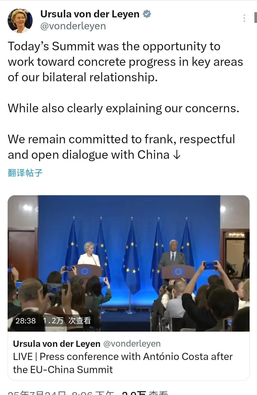 7月24日,中欧峰会短暂且充实的日程已经结束了。从冯德莱恩或者欧盟的视角来看,如