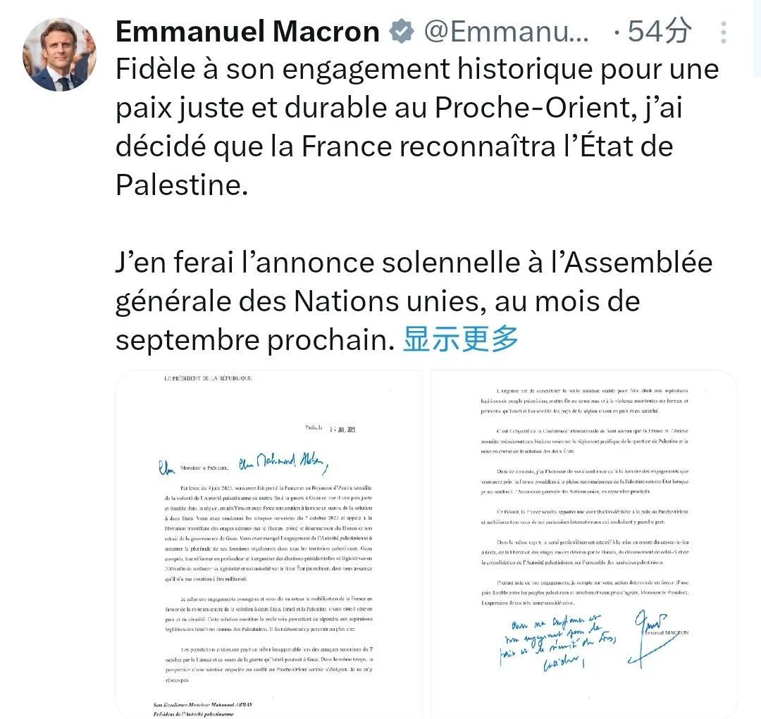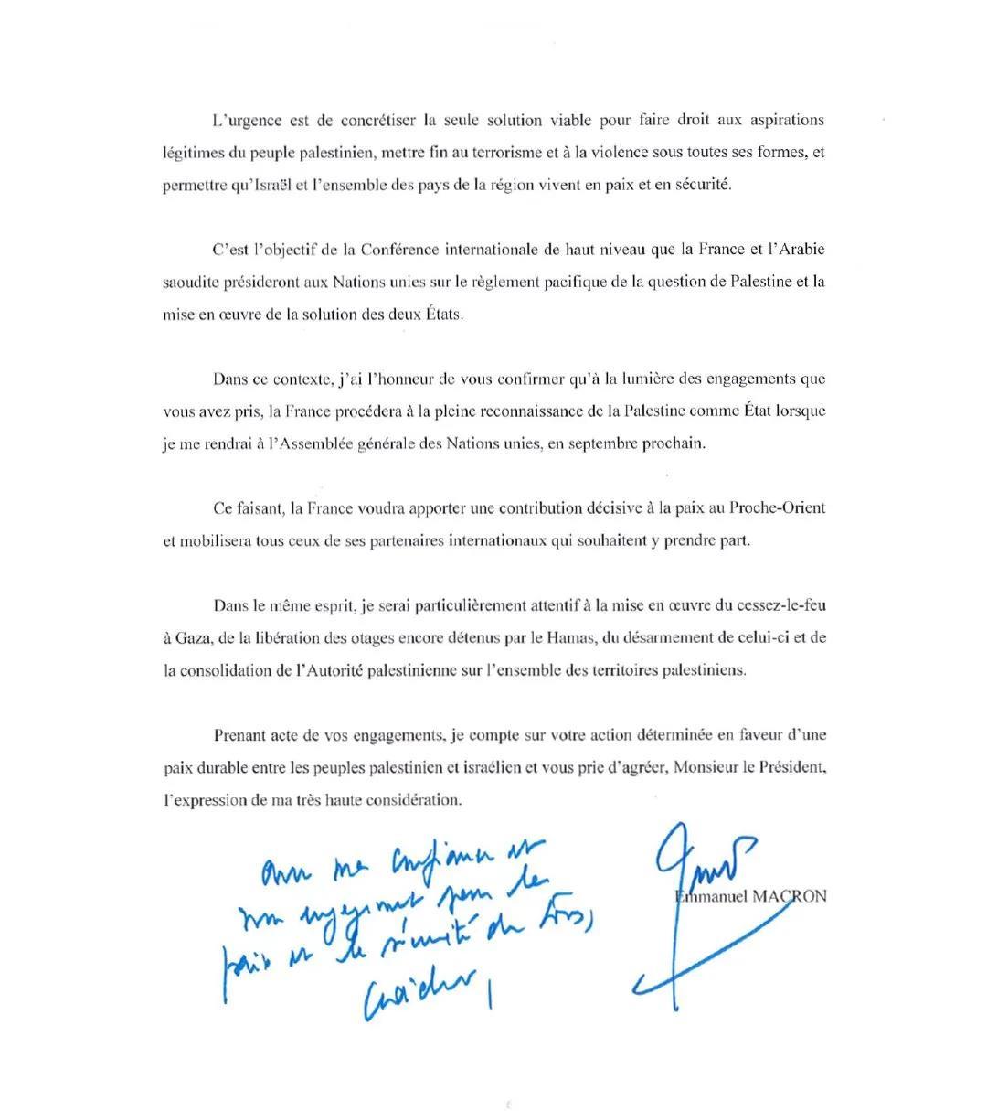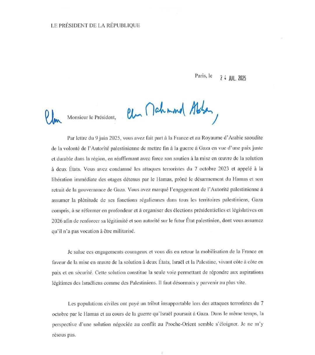 7月25日,法国总统马克龙在其个人社交媒体平台上,公布了其发给巴勒斯坦总统阿巴斯