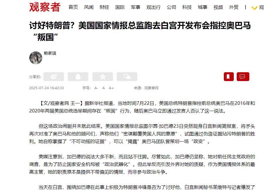 讨好特朗普?美国国家情报总监跑去白宫开发布会指控奥巴马“叛国”。这出戏够荒诞:掌管国家情报的头号人物,撇下中立职责冲到前台,对着前总统喊“叛国”,身后还跟着举摄像机的丈夫全程记录。更诡异的是,几个月前她还被特朗普怼“不在乎你说啥”,如今突然成了总统口中“最炙手可热的人”。这场劲爆指控,偏巧赶在爱泼斯坦案闹得沸沸扬扬时上演,难免让人看穿些门道。 说起来,这事儿跟爱泼斯坦案脱不了干系。特朗普竞选时拍着胸脯说要公布相关文件,结果司法部和 FBI 最近说压根没什么 "客户名单",也不会再放新料。 这下不光反对者炸了锅,连他自己的支持者都不乐意了,舆论正闹得凶。 就在这时候,加巴德跳出来喊着要查奥巴马,特朗普也赶紧跟着起哄,俩人配合得挺默契,明摆着是想把大家的注意力从爱泼斯坦案上移开。 加巴德这戏演得够卖力。她去白宫开记者会,还带着拿摄影机的丈夫,像是要把这一幕记下来。 手里举着份共和党人多年前写的报告,翻来覆去说里面提到情报评估有 "技术失误",还抓着些没证实的小道消息说事儿。 稍微懂点的都知道,那报告根本不是当年调查的依据,就是拿来凑数的。 她也说不清楚为啥当年不解密,只说交给司法部了,结果几小时后司法部就宣布成立 "打击小组",这速度快得让人起疑。 更有意思的是她跟特朗普的关系。前几个月特朗普还说 "不在乎她讲什么",因为她对伊朗核问题的看法跟自己对不上。 这才没多久,加巴德就像换了个人,跑到椭圆形办公室汇报工作,句句都顺着特朗普说。特朗普也立刻变了脸,公开夸她 "忠诚",说她是 "房间里最受关注的人"。 这前后反差也太大了,难怪大家觉得她在拼命讨好特朗普,想保住位子。白宫新闻秘书还跟记者吵起来,说不是这么回事,可谁信啊。 奥巴马这次是真忍不住了。本来他不想掺和这些事,结果特朗普不仅喊着要查他,还发了段人工智能做的 "逮捕视频",里面奥巴马被送进监狱时,特朗普还咧嘴笑。 换谁都忍不了,奥巴马只好让发言人出来说,这些指控全是瞎编的,就是为了转移视线。 民主党那边气坏了。参议院的马克?华纳讽刺说,特朗普政府解密别的文件挺积极,就爱泼斯坦档案藏着掖着。 众议院的吉姆?海姆斯更直接,说加巴德的说法跟之前好多靠谱调查结果对不上,让她赶紧辞职。她这么一搞,情报部门的专业性全没了,以后工作咋开展? 现在这局面,看样子收不了场。司法部的 "打击小组" 会咋查,加巴德那些 "证据" 站不站得住脚,奥巴马会不会有进一步动作,都不好说。 但有一点很清楚,这场闹剧说到底就是党派斗争的工具,把国家机构当自家武器用,最后坑的还是美国自己的信誉。 这么闹下去,越来越多人会看清,所谓的 "民主",不过是些人争权夺利的幌子罢了。