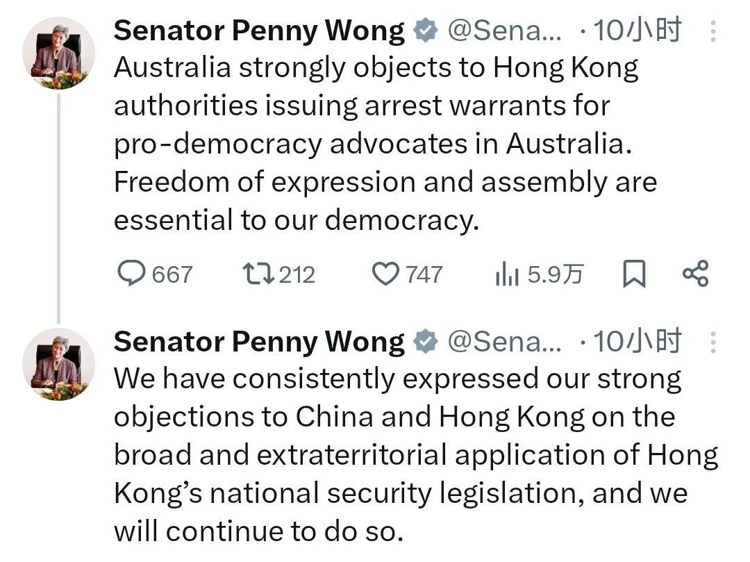 7月26日,澳大利亚的外长黄英贤在个人社交媒体上连发两条文章,批评香港方面追捕旅