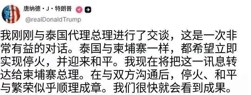 7月27日,特朗普突然在个人的社交媒体上发文,表示刚刚和泰国代总理进行了交谈,并
