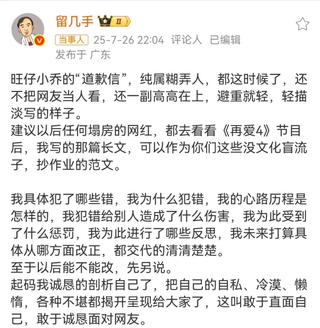 #旺仔小乔道歉信# #留几手说旺仔小乔道歉信糊弄人# 汪苏泷张碧晨撕破脸的直接导火索“旺仔小乔”发出道歉信,称自己接受一切批评。网络大V手哥看了直接点评内容是糊弄人,让其看看自己《再见爱人4》的内容,是道歉信的典范!手哥出手一个顶俩,手哥什么时候进的战场?[笑哭]