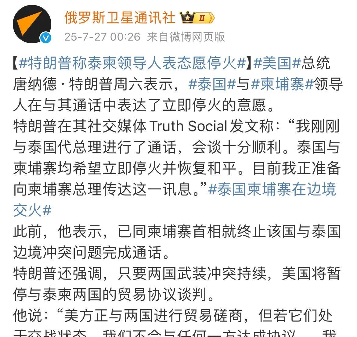 【离和平奖又近一步,特朗普有望调停泰柬冲突】 据俄通讯社消息,美国总统特朗普表示