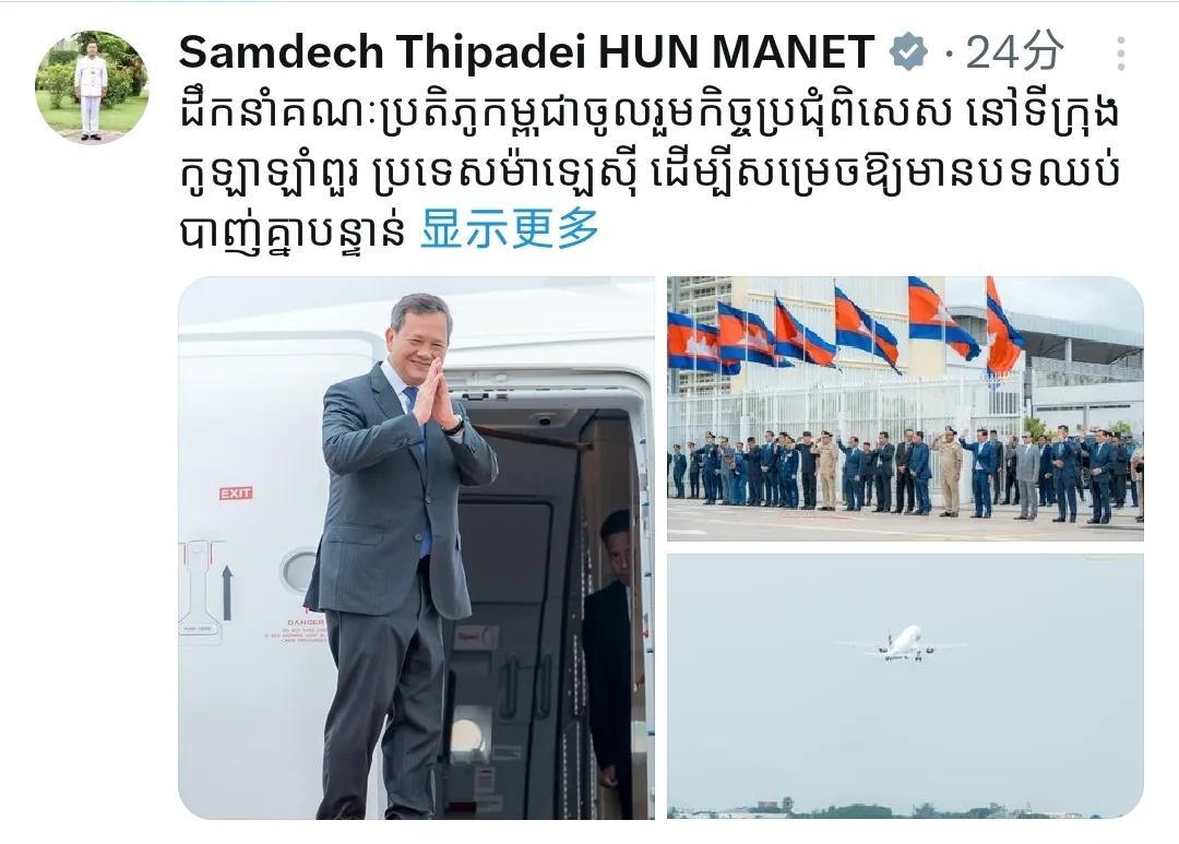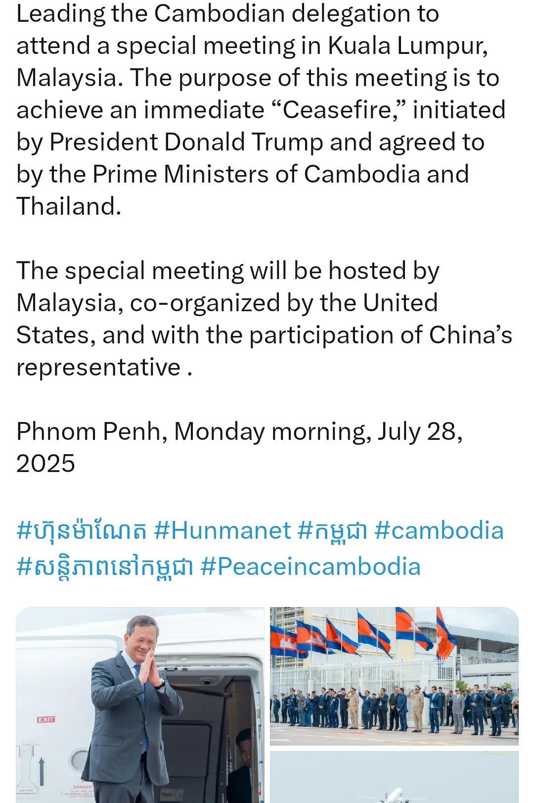 7月28日中午,柬埔寨首相洪玛奈在其个人社交账号上发文,他已经带领柬埔寨的代表团
