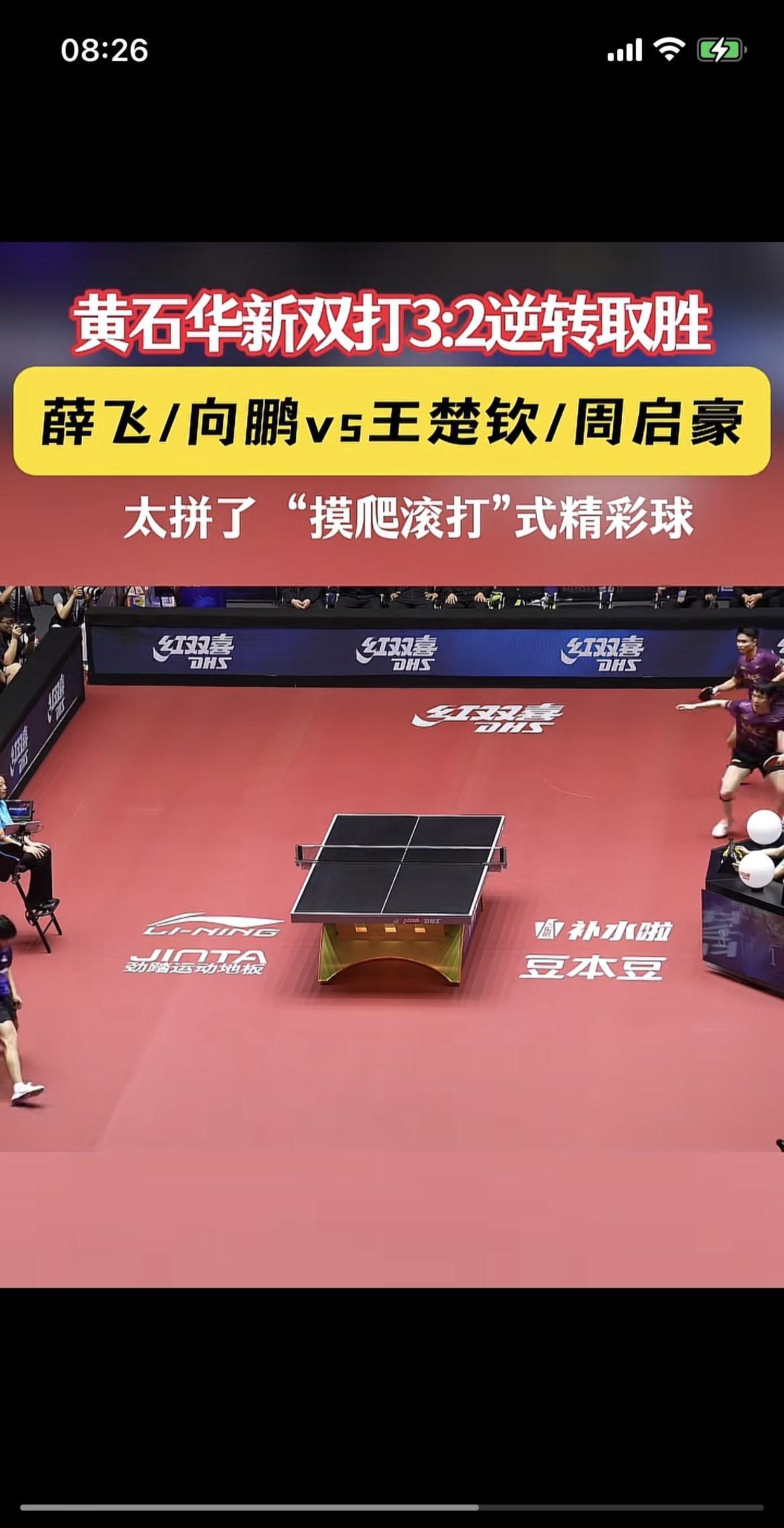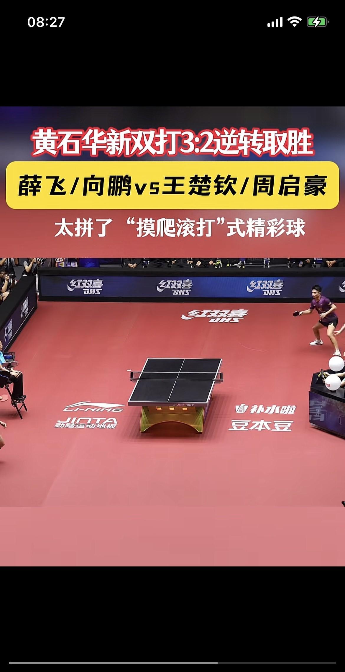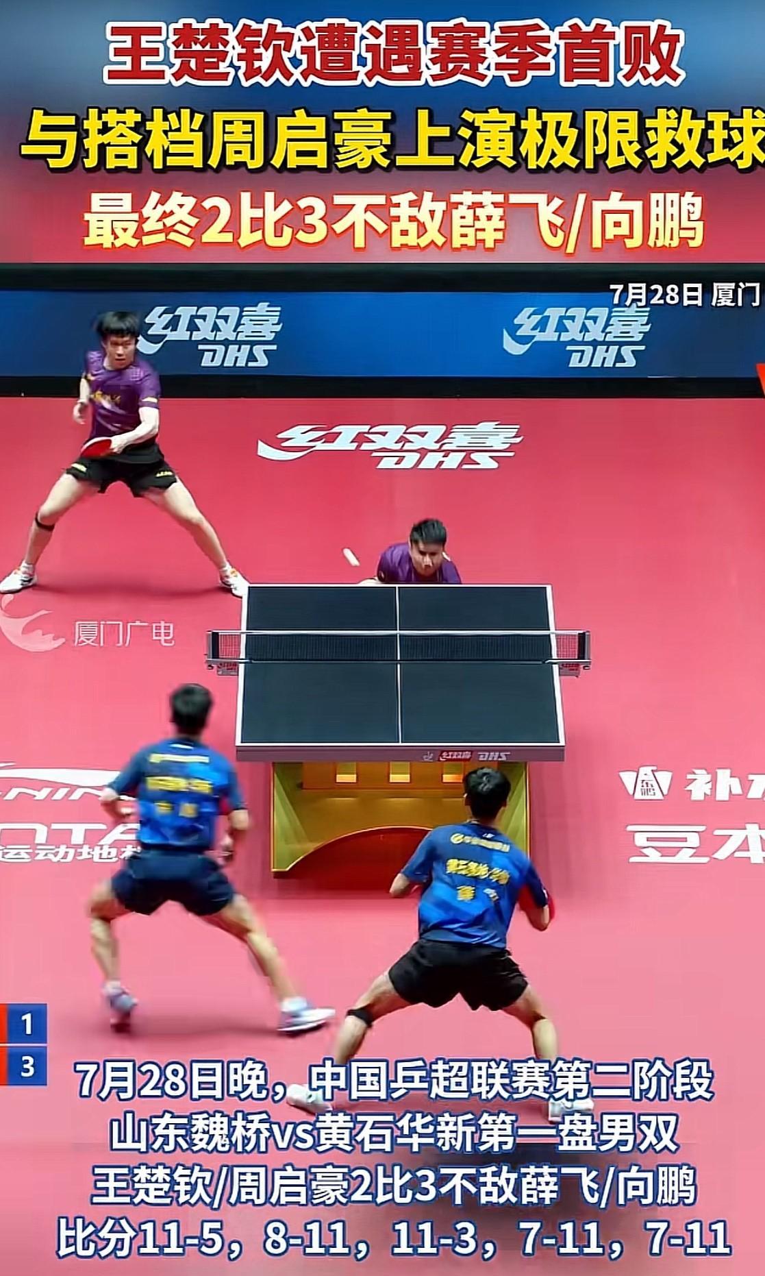 山东魏桥输在了男双 28日黄石基地3:1战胜山东魏桥 山东魏桥就王楚钦得一分。黄石基地薛飞向鹏男双得一分。林诗栋得两分。 山东魏桥输了。输在男双了。 王楚钦周启豪不应该输给薛飞向鹏。 薛飞向鹏都打不过王楚钦。 无论黄友政,还是周启豪都打不过林诗栋。所以男双输了山东魏桥就输了。 但是山东魏桥积分依然排第一。 王楚钦周启豪2:3输给了薛飞向鹏 这场比赛应该是最精彩的男双比赛了。 这场比赛薛飞向鹏完全放开了打。 但是王楚钦周启豪打的也非常好。 四个人大战五局,打的难解难分。 王楚钦周启豪赢的两局第一局11:5,第三局11:3。都是大比分赢。 第二局薛飞向鹏11:8战胜王楚钦周启豪 而且王楚钦对阵向鹏 林诗栋对阵黄友政 都是锻炼新人。有利于向鹏黄友政的提高。