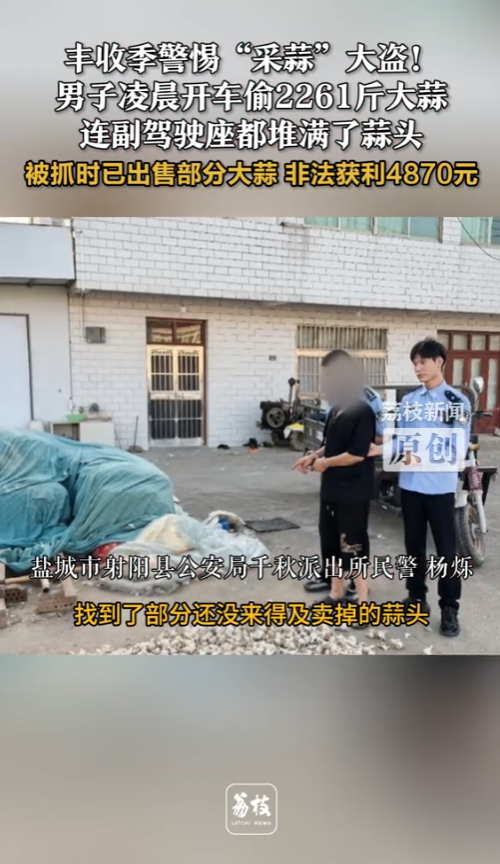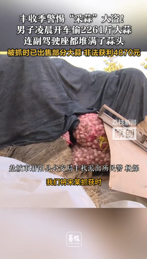 信息来源:《丰收季警惕“采蒜”大盗!男子凌晨开车偷2261斤大蒜,连副驾驶座都堆满了蒜头,被抓时已出售部分大蒜,非法获利4870元》荔枝新闻