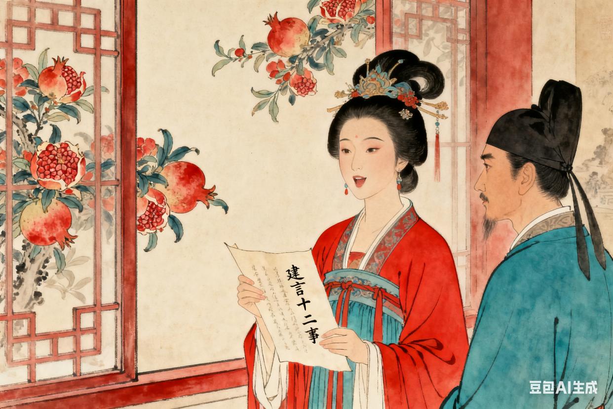 上元元年的朝会上,武则天站在高宗身边,提出了 “建言十二事”。她手里拿着奏疏,声音清亮地念着 “劝农桑,薄赋徭,息兵戈,禁淫巧”,大臣们有的点头,有的皱眉。高宗坐在龙椅上,时不时看她一眼,眼神里满是信任。散朝后,她回到后宫,把奏疏放在案头,又拿起那支玉笔,在空白的纸上写了 “二圣” 两个字。窗外的石榴花开得正艳,她想起家里的那棵石榴树,突然觉得,自己已经不是当年那个需要靠石榴花找安慰的小女孩了 —— 现在的她,能为这天下,种出一片更茂盛的 “石榴林”。