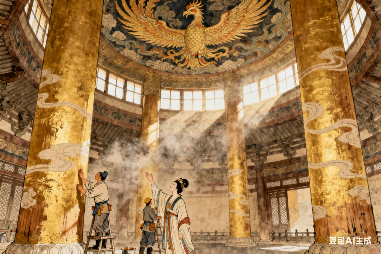 垂拱四年的秋天,明堂终于建成了。武则天站在明堂的第一层,抬头看着顶部的凤凰雕塑,阳光从窗户里照进来,落在她的帝袍上。工匠们还在给殿柱刷漆,空气中满是油漆和木材的味道。她伸手摸了摸殿柱,柱子很粗,需要两个成年人才能抱过来。旁边的官员说,这明堂高三百尺,号称 “万象神宫”,是天下最宏伟的建筑。她笑了笑,没说话 —— 她知道,这明堂不仅是一座建筑,更是她权力的象征,是她告诉天下人,女人也能撑起一片天的证明。