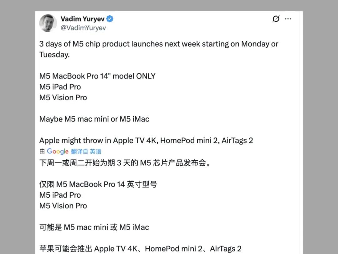 这六款新品与其他媒体的报道基本一致,至于M5版Mac mini和iMac虽然此前没有过多提及,但也有可能同期亮相。按照惯例,苹果十月份的新品应该不会特意举办发布会,而是像去年一样以新闻稿的方式官宣上架。Vadim Yuryev表示,本轮新品发布将为期三天,预计于下周一或下周二开启。
