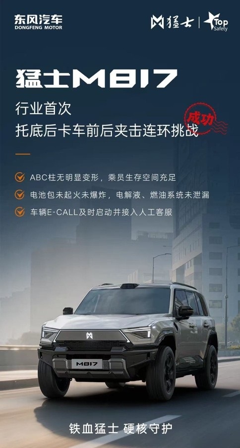 7月17日,猛士M817即将开启预售,而在此之前,它已凭借一场行业首次的“托底+卡车前后夹击”连环碰撞挑战,赢得了广泛关注与赞誉。在这场远超国标的极限测试中,猛士M817展现了其超乎寻常的安全性能。当车辆托底后,紧接着以50km/h的时速撞击22吨重的卡车,随后又遭遇5吨卡车以同样速度追尾夹击,这样的“三连击”对于任何车辆来说都是致命的考验。然而,猛士M817却在这场测试中成功挺立,乘员舱完好无损,电池包未起火未爆炸,电解液、燃油系统也未发生泄漏。更为先进的是,车辆E-CALL系统在碰撞瞬间即时启动,并成功接通了人工客服,为乘员提供了及时的救援保障。