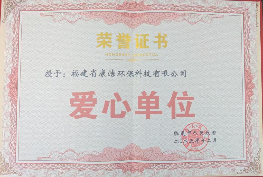临夏市政府授予:福建省康洁环保科技有限公司“爱心单位”荣誉称号。