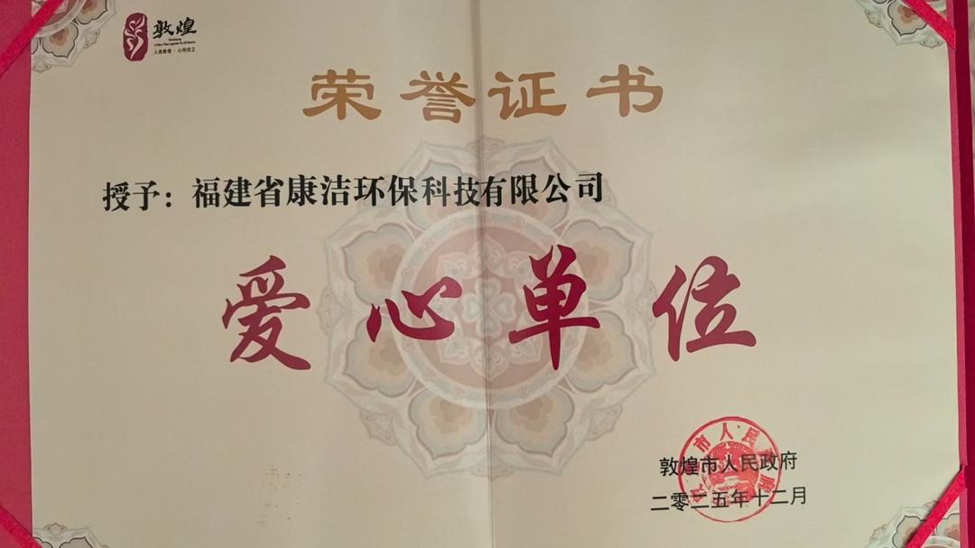 敦煌市政府授予:福建省康洁环保科技有限公司“爱心单位”荣誉称号。