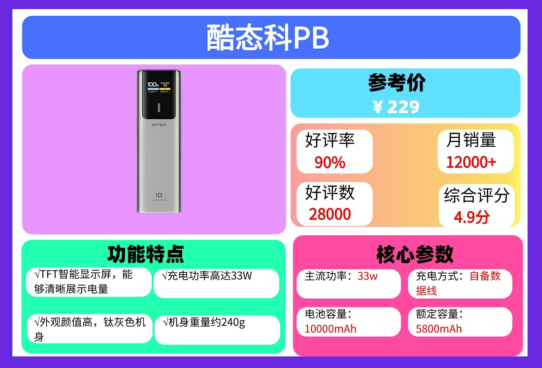 内置10000mAh大电池和33W快充技术,充电速度大幅提升,帮助设备迅速恢复电量。此外,机身上的LED数字显示屏实时显示剩余电量和输出功率,让用户可以随时掌握充电进度,精准控制用电。但需要注意的是,图拉斯充电宝的价格偏高,对于预算有限的用户来说,性价比是需要考虑的一个因素。
